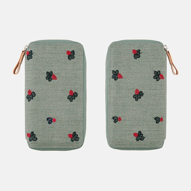 The material comes in green cotton linen with a gentle touch. It is embroidered with pretty berry embroidery in red and navy threads.