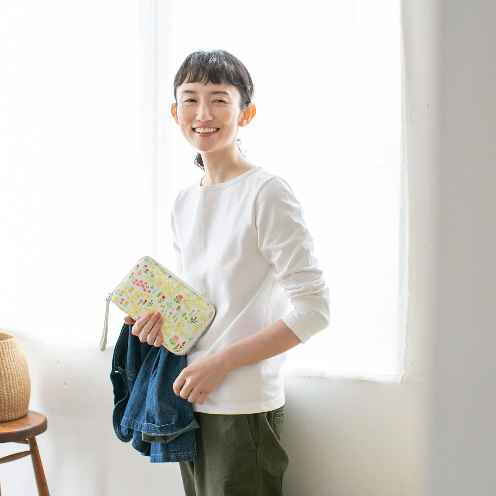 This printed fabric was illustrated by Aki Kondo, who is famous for creating picture books, coming up with the concept for Rilakkuma, and creating the characters Mofy the rabbit, woo and wah, and Ofuton-san. There’s a soft, mint blue background and a host of yellow and red flowers painted in watercolor to cheer you up. The interior is a vivid pink.