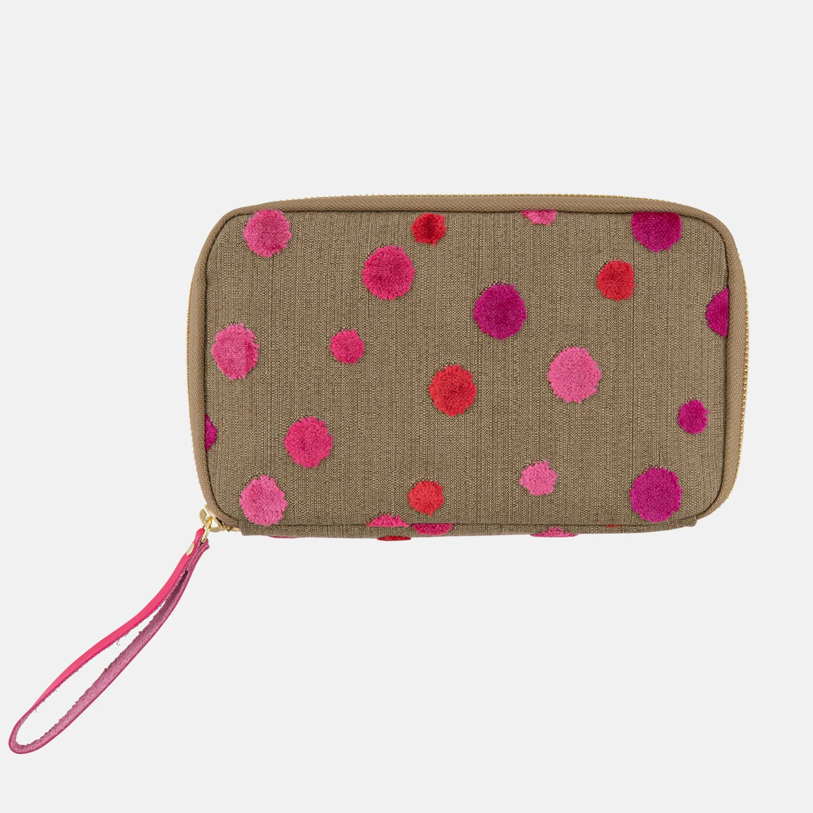 The polka dots have dynamic shapes to them, as if they were drawn freehand, and their texture is pleasing to the touch. There’s a warmth to the textile that doesn’t detract from the gorgeous look. The interior and hand strap are both hot pink.