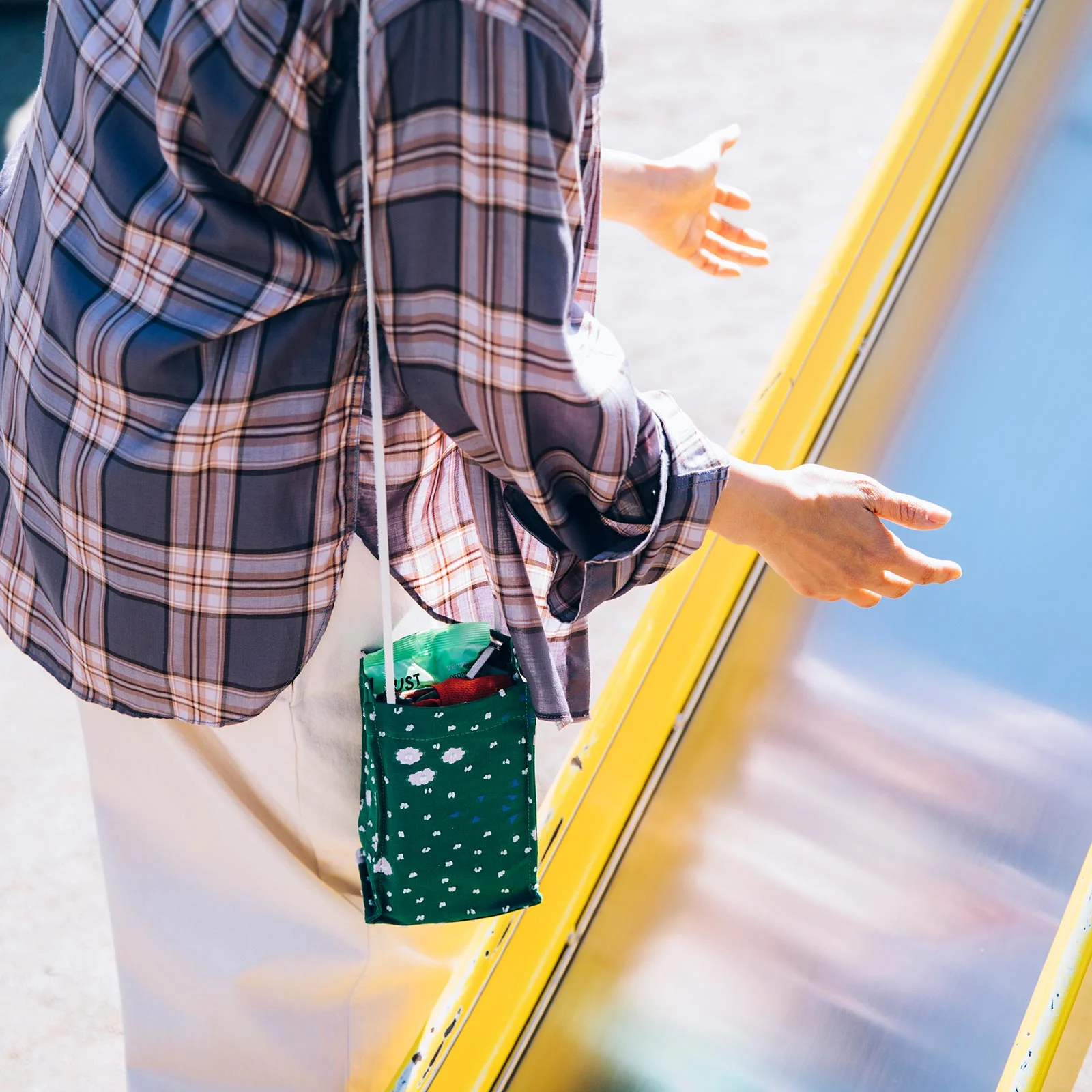 The pouch will serve as small messenger bag for when you go out. If you feel that you’re not going to come home empty handed, put in a folded reusable bag before you leave the house.