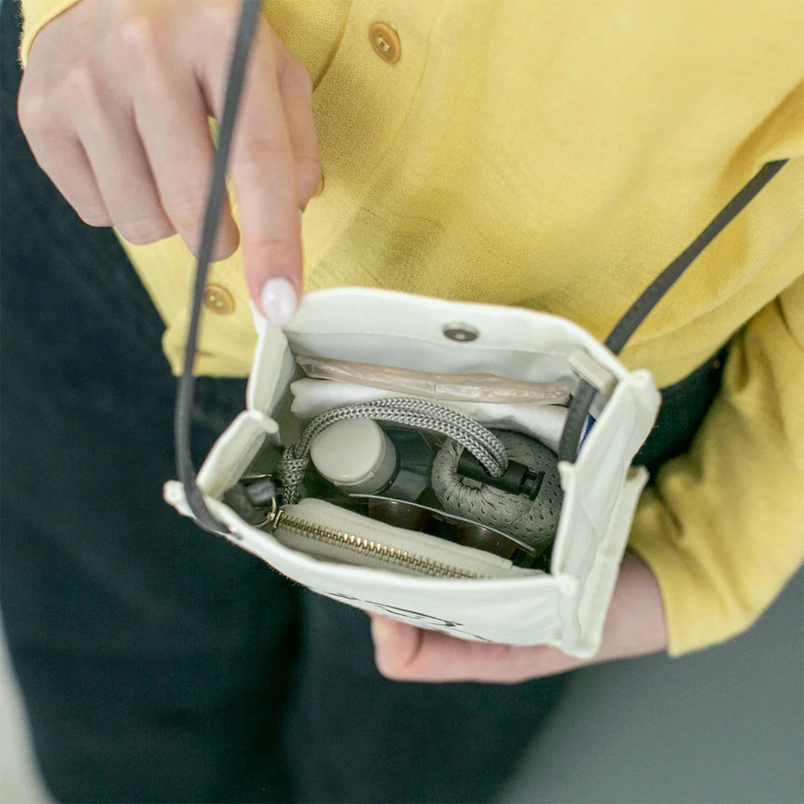 It has a thin strap to hang from your shoulder so you can keep your hands free while you carry around the items you need. You can adjust the length of the strap with an adjuster.