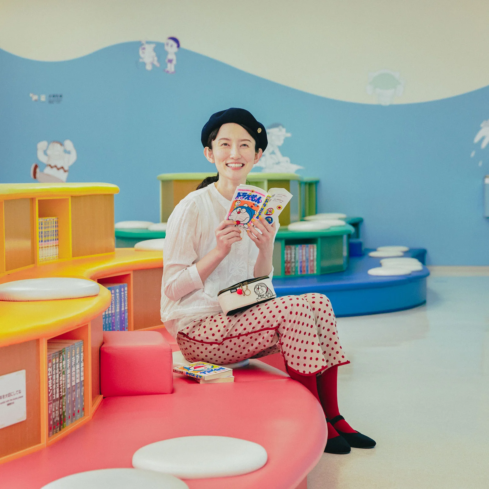 Doraemon rides on a time machine from the 22nd century and saves Nobita with various secret tools pulled out from his “4D pocket.” This pouch depicts the scene in the manga where Doraemon appears for the very first time using embroidery. The color scheme uses black and white, creating a chic look. This scene of Doraemon coming out of a desk “drawer” and Nobita jumping up in surprise is perfect for the “Drawer” Pouch.