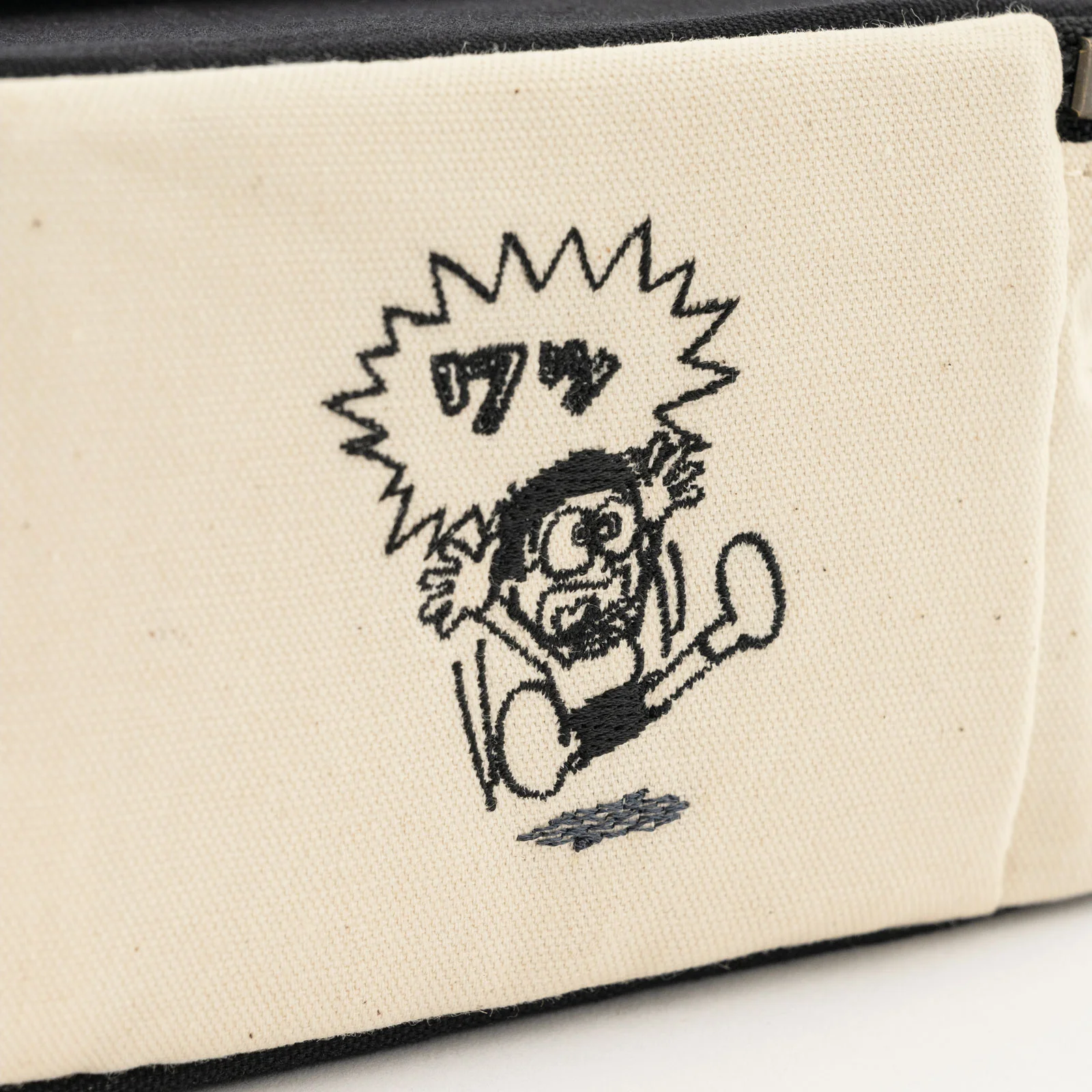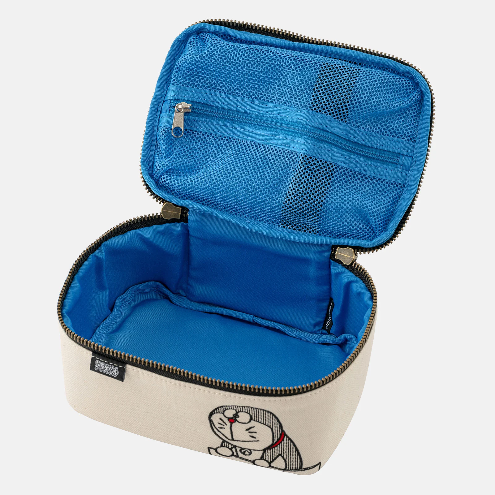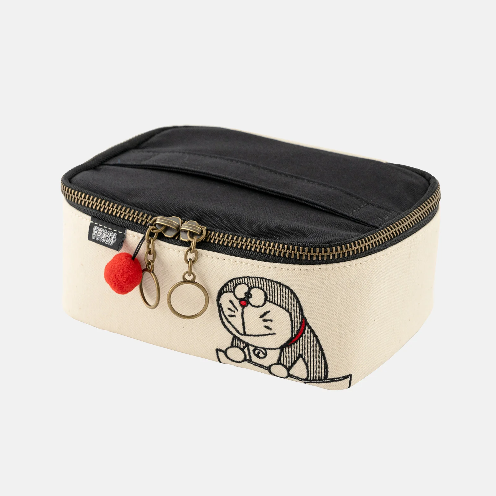 The outside uses a simple ecru and black canvas material, but open the pouch to reveal vivid Doraemon-like colors. The zipper pull is a round charm, just like Doraemon’s tail. The black tag with the words “Doraemon” printed in white adds an accent to the look.