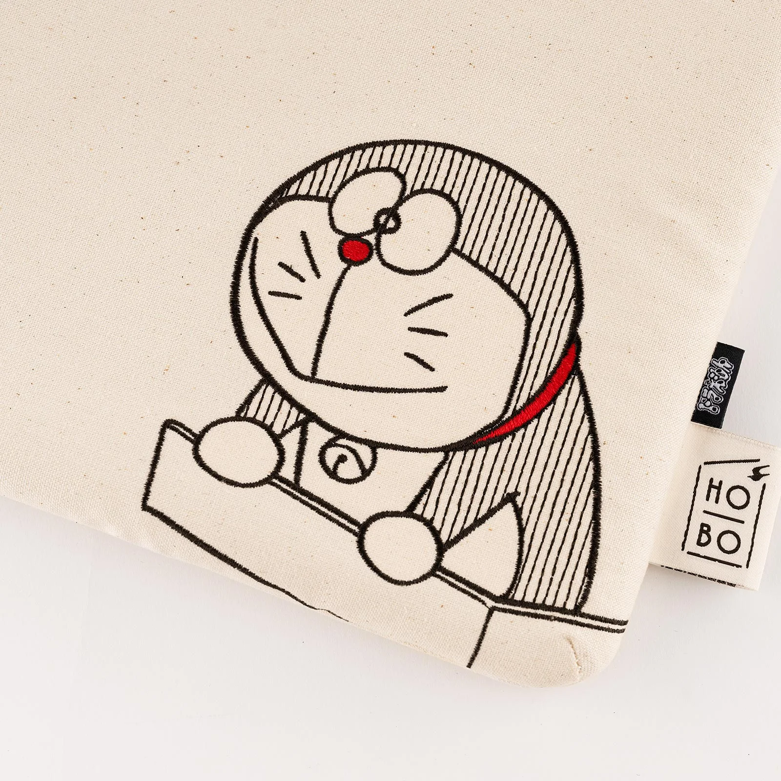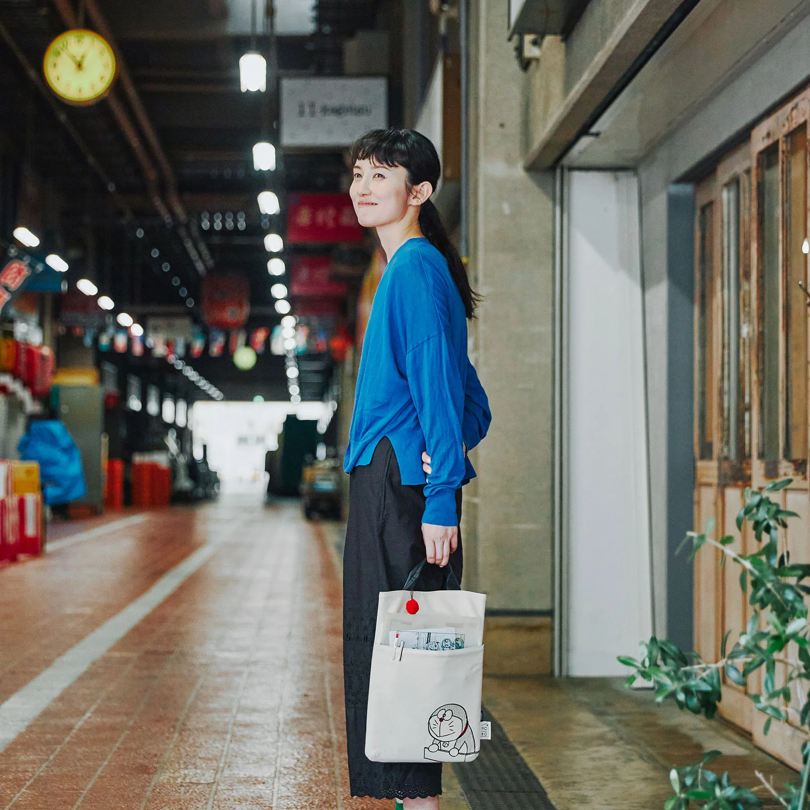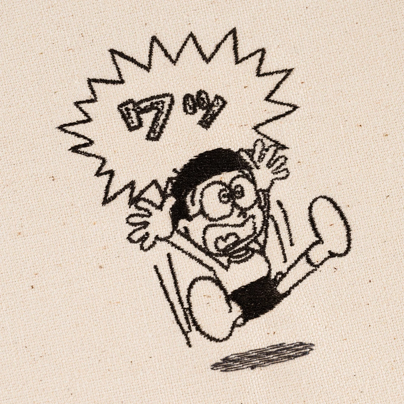Doraemon rides on a time machine from the 22nd century and saves Nobita with various secret tools pulled out from his “4D pocket.” This tote bag uses embroidery to depict the scene in the manga where Doraemon appears for the very first time. The color scheme uses black and white, creating a chic look.