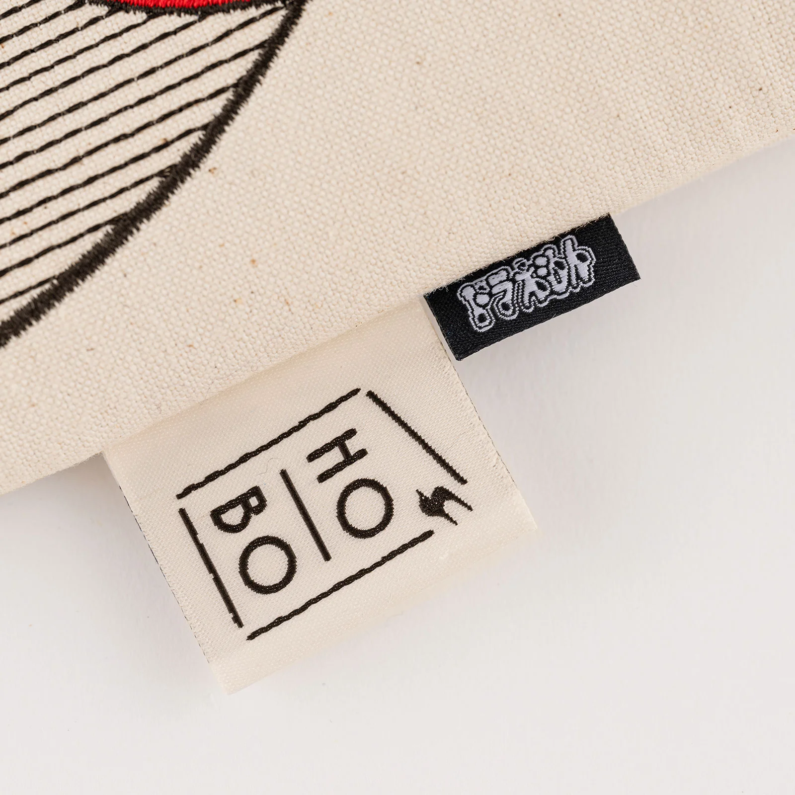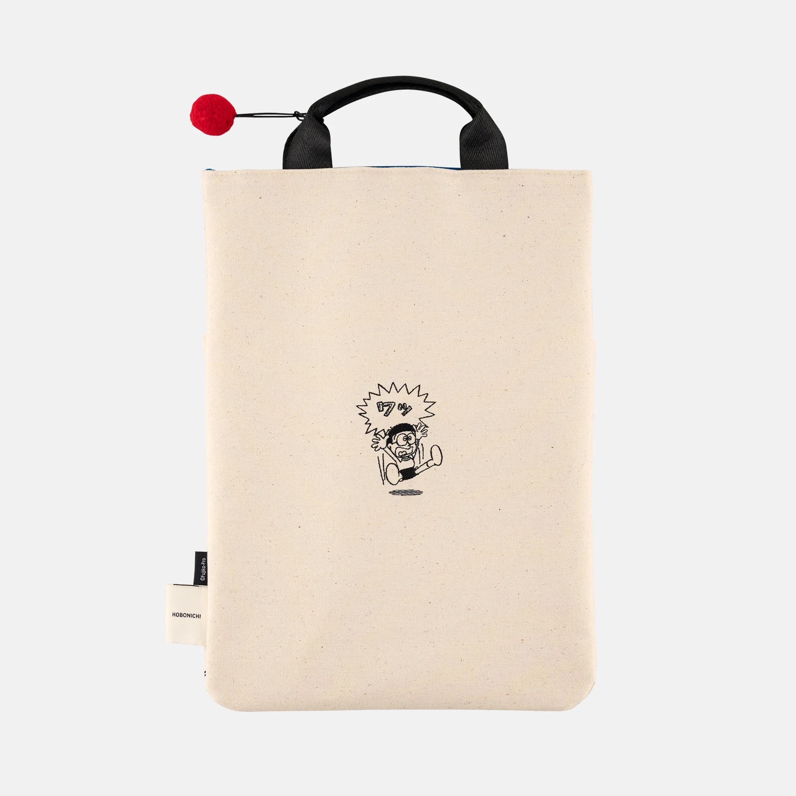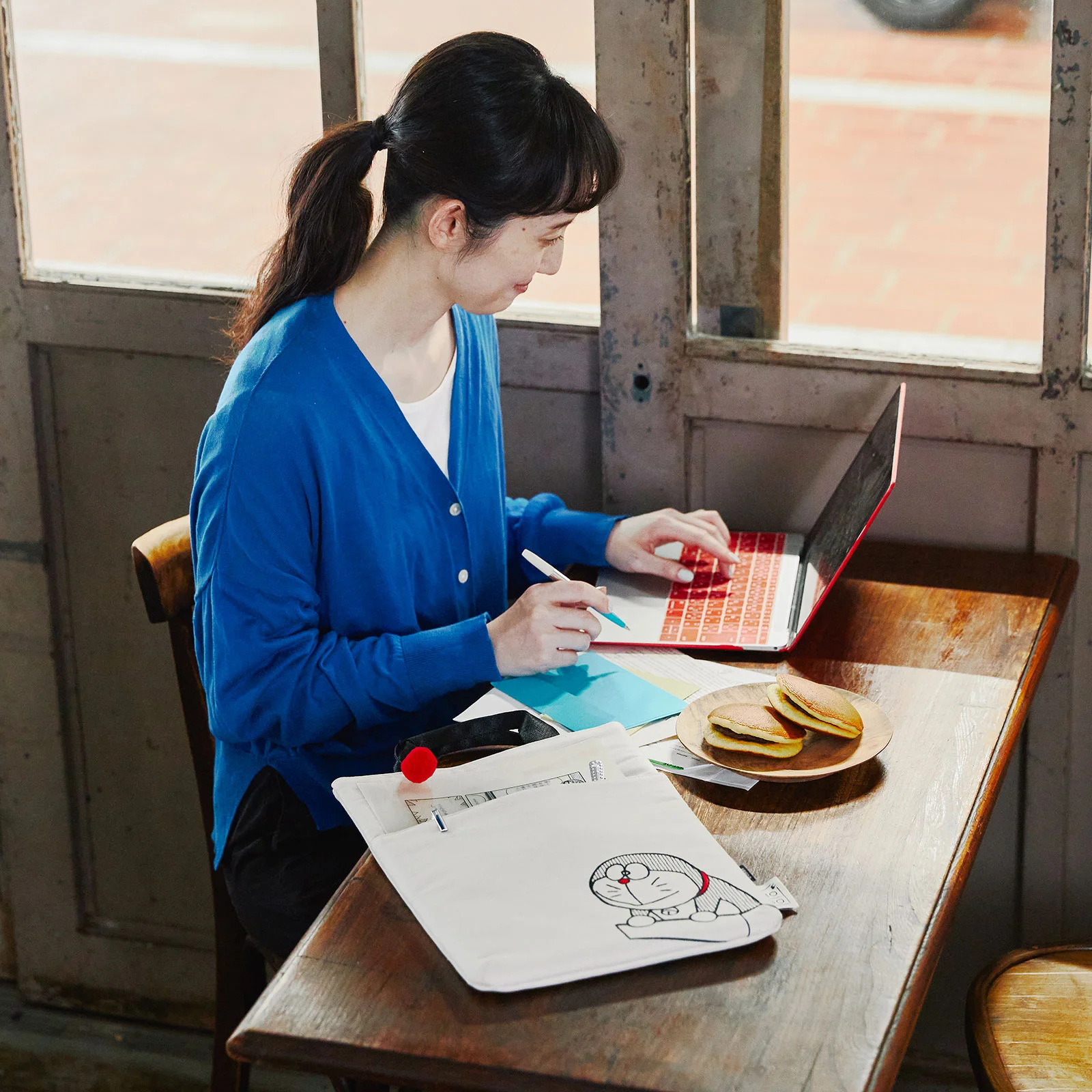 Doraemon rides on a time machine from the 22nd century and saves Nobita with various secret tools pulled out from his “4D pocket.” This tote bag uses embroidery to depict the scene in the manga where Doraemon appears for the very first time. The color scheme uses black and white, creating a chic look.