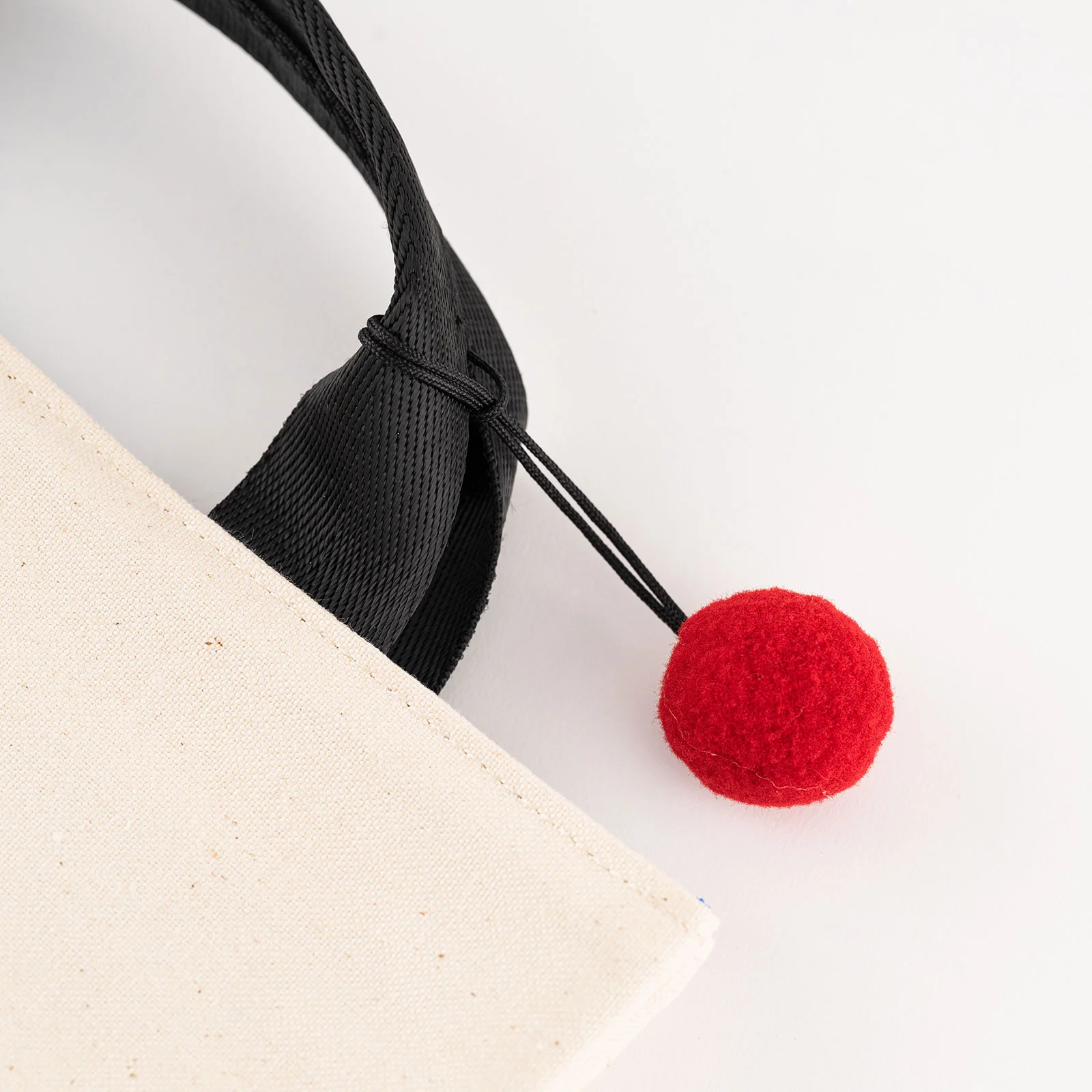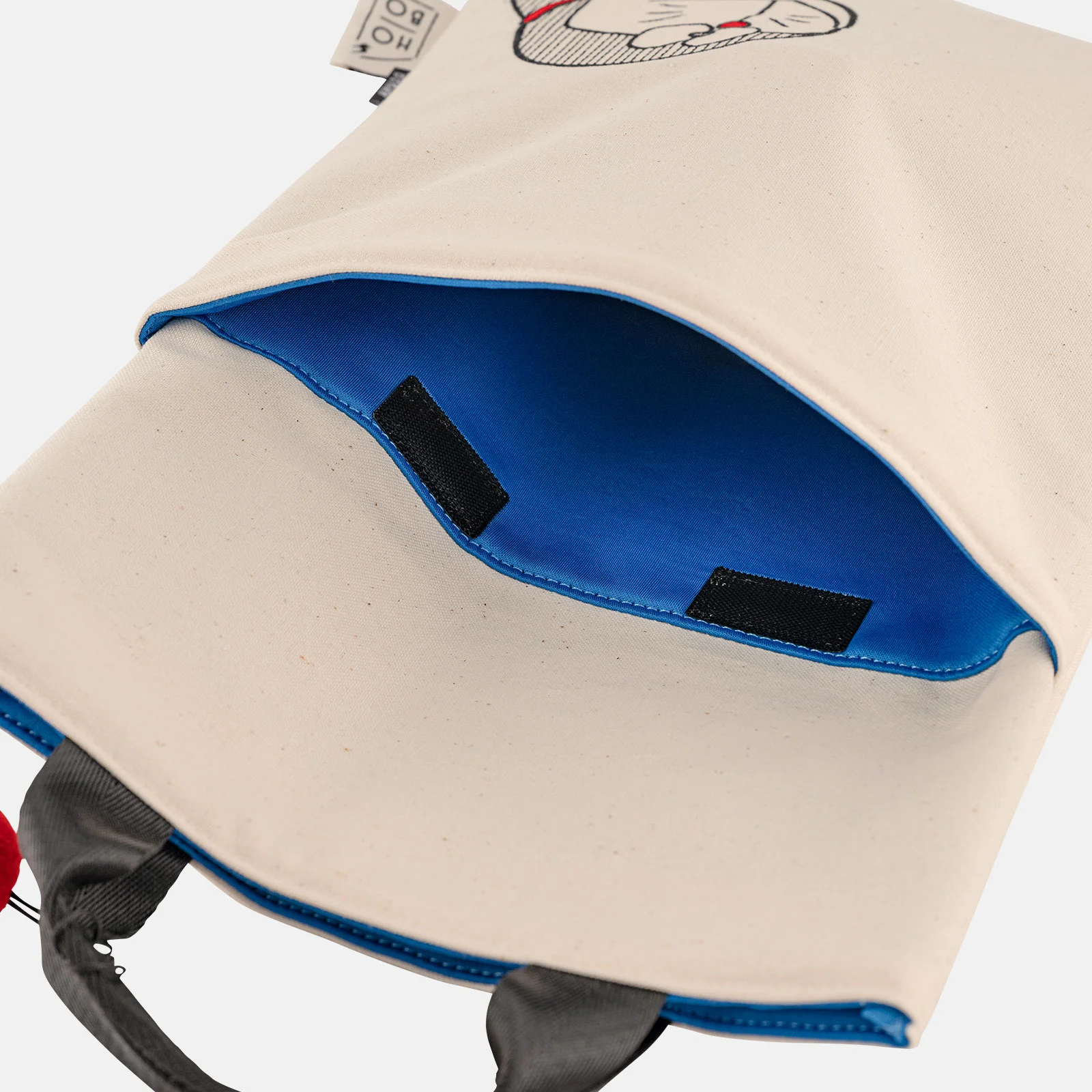 The outside uses a simple ecru canvas material, but open the bag to reveal vivid Doraemon-like colors. The handle is a black nylon belt that’s thick enough to hold comfortably. The bag also contains a round charm to evoke Doraemon’s tail. Attached to the bag is a black tag with the logo “Doraemon” in white for a nice accent.