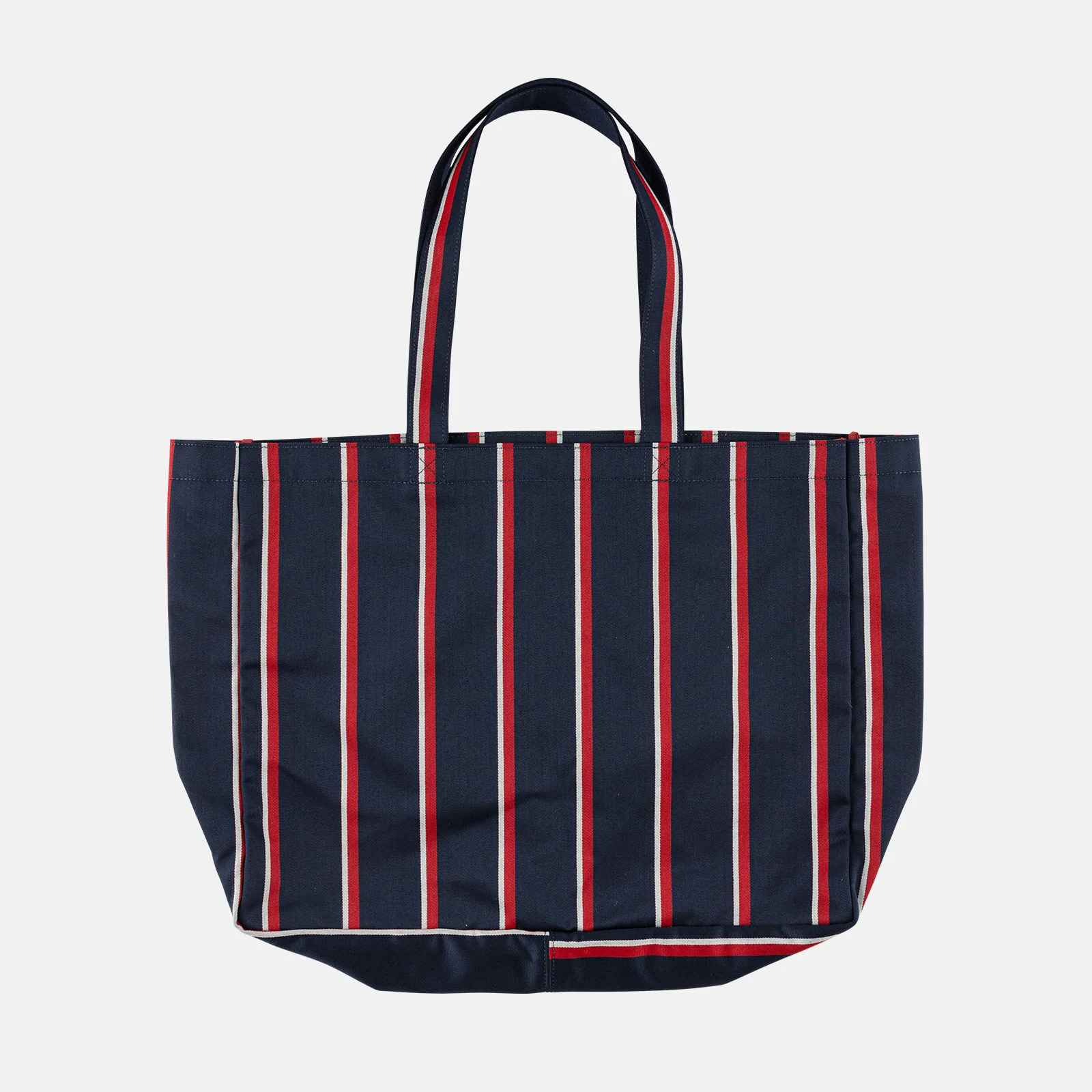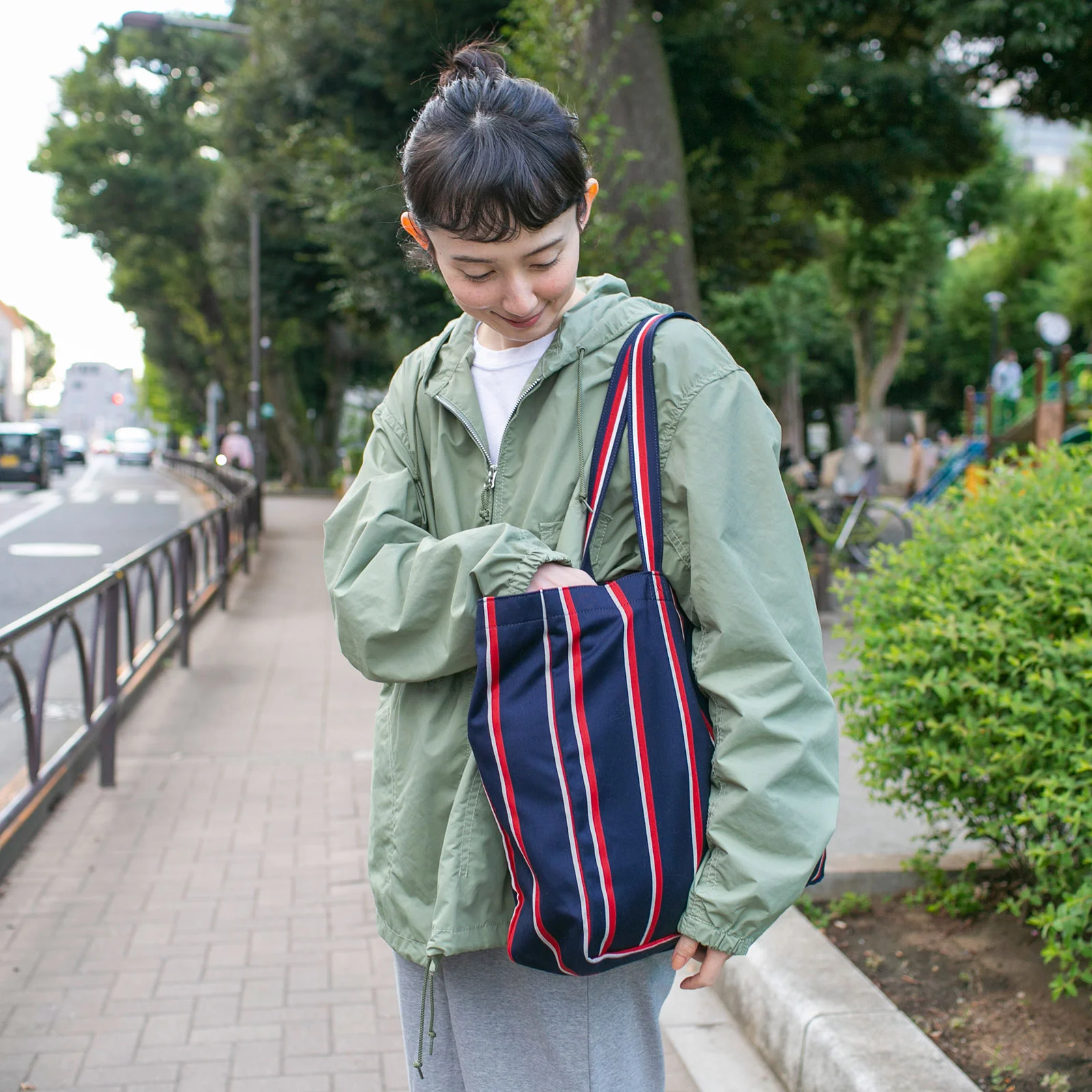 Abraham Moon & Sons is a renowned fabric brand from England. This design is made with a wool blend. The spick-and-span yet fashionable stripes evoke the image of a blazer that a British gentleman would wear. The navy, red and white color scheme offers a sophisticated and traditional looking bag. The interior is a calm hue of wine red.