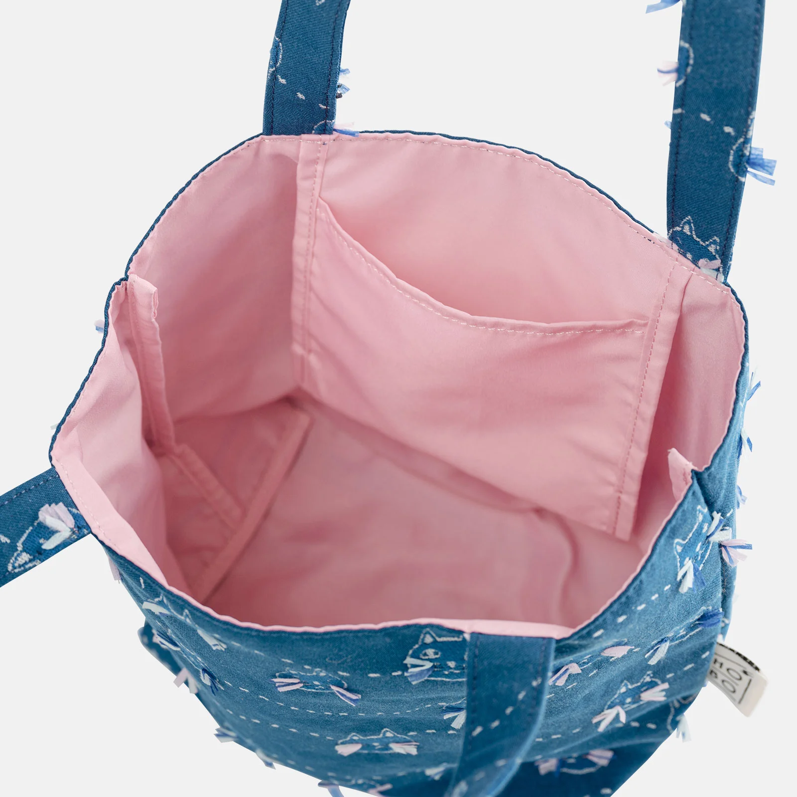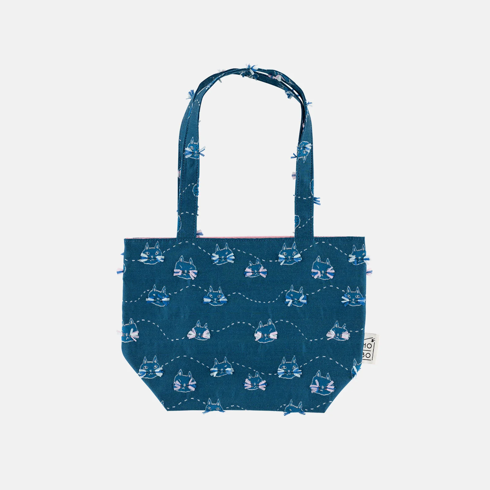 Whisker Cat places stitched images of cute cats and wavy lines against a deep blue background. The cats’ whiskers are made with white, pink, and light blue threads that have been cut one by one to the perfect length so you can enjoy the feel of the 3D effect against your fingertips. Look closely and you’ll see the faces of the cats vary, including some with wide eyes and some with narrowed eyes. The bag interior has a lustrous pink material to provide a charming contrast against the blue every time you open the bag.