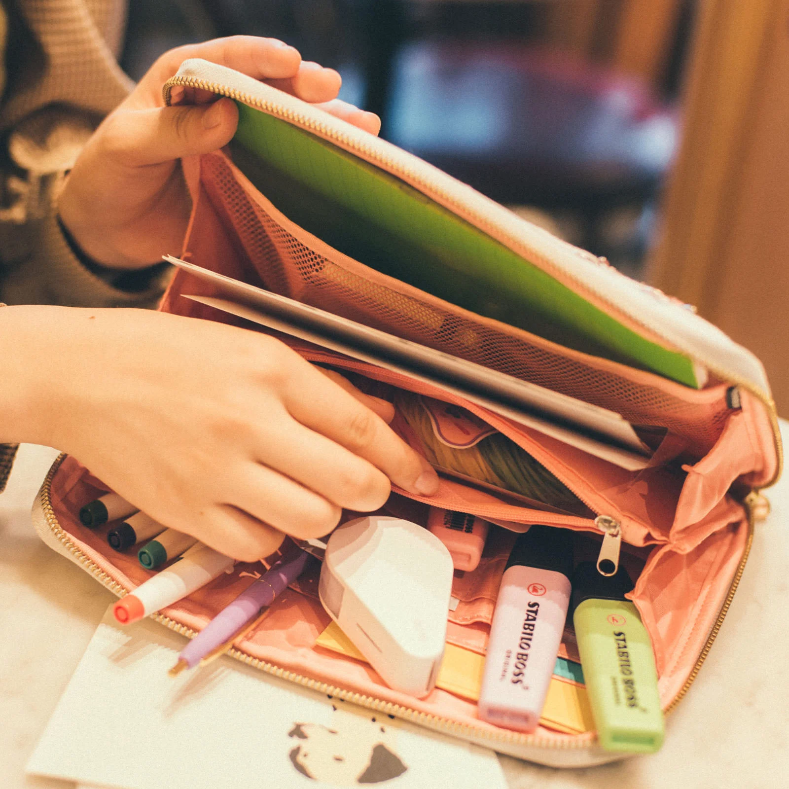 The pouch can provide storage like a tool box, allowing you to separate and organize items within the pouch, such as pencils, paperclips, notebooks, washi tape, and other stationery. (Pictured: Cactus)