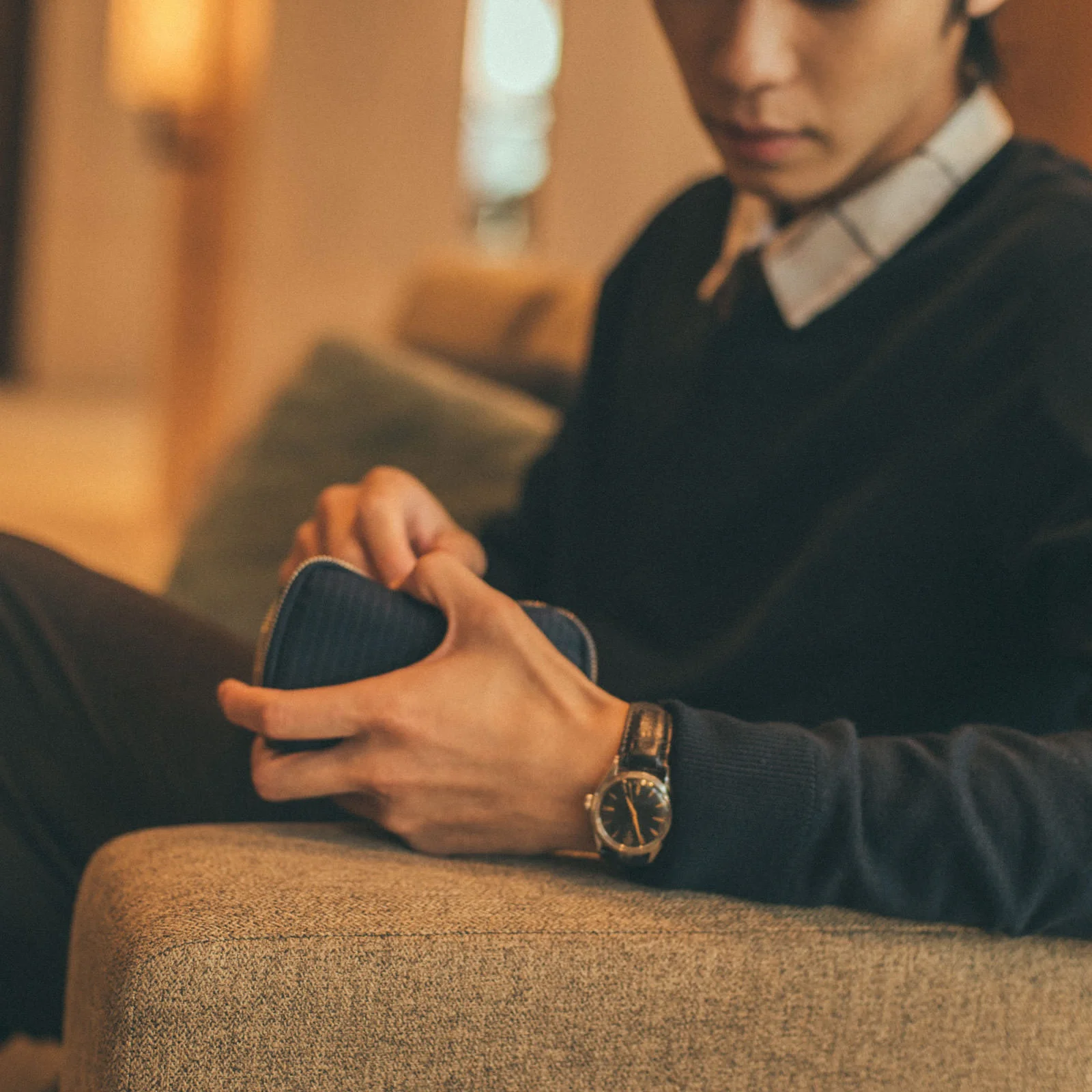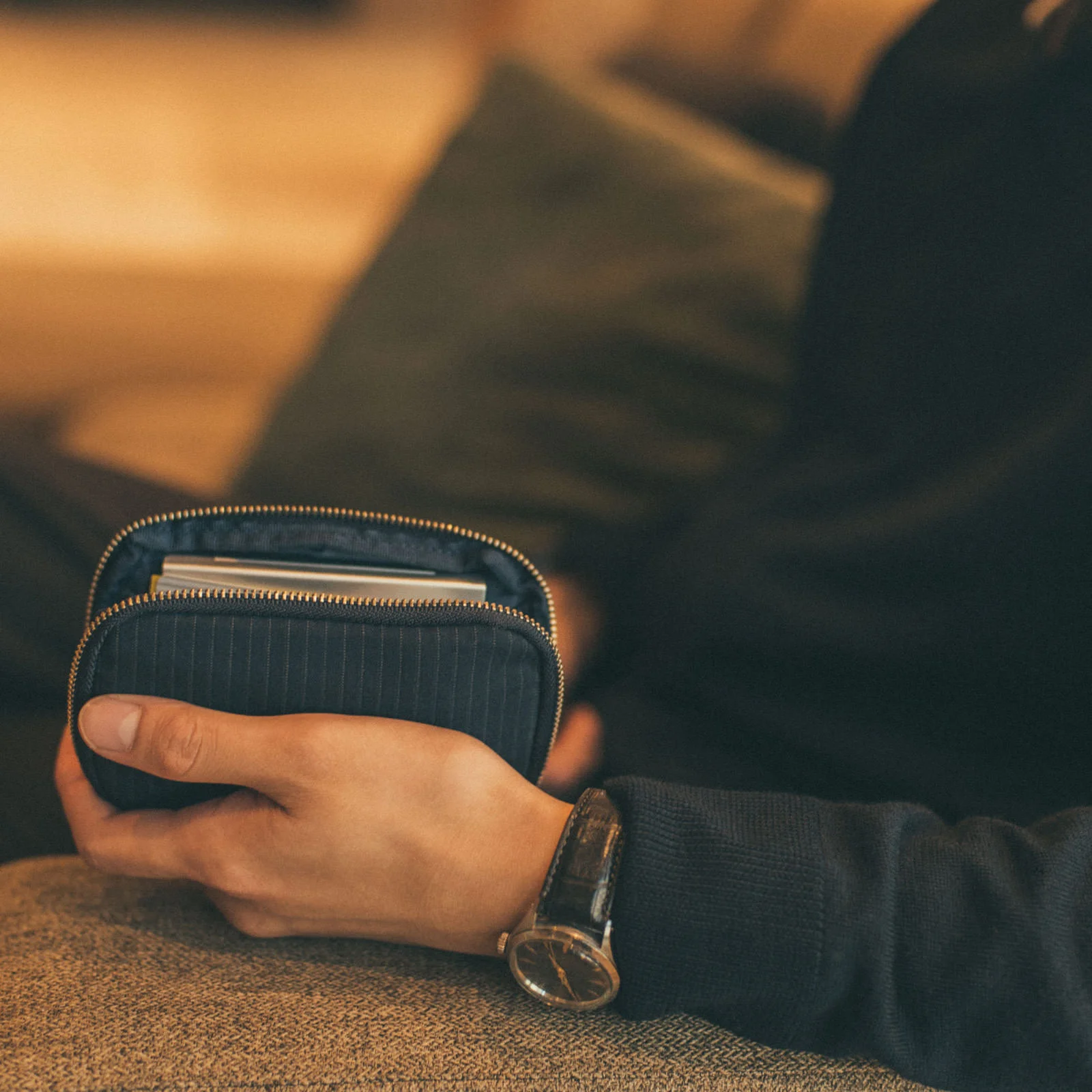 Suit Fabric: Navy Stripes is a Drawer Pouch specially made with high-quality suit fabric called Cordura Combat Wool, a high-quality textile that is stronger than wool. The simple yet stylish navy color overlaid with thin stripes provides a look that fits seamlessly into any setting. The pouch handle is made with navy leather and includes a small carabiner. The pouch interior is a plain navy hue.