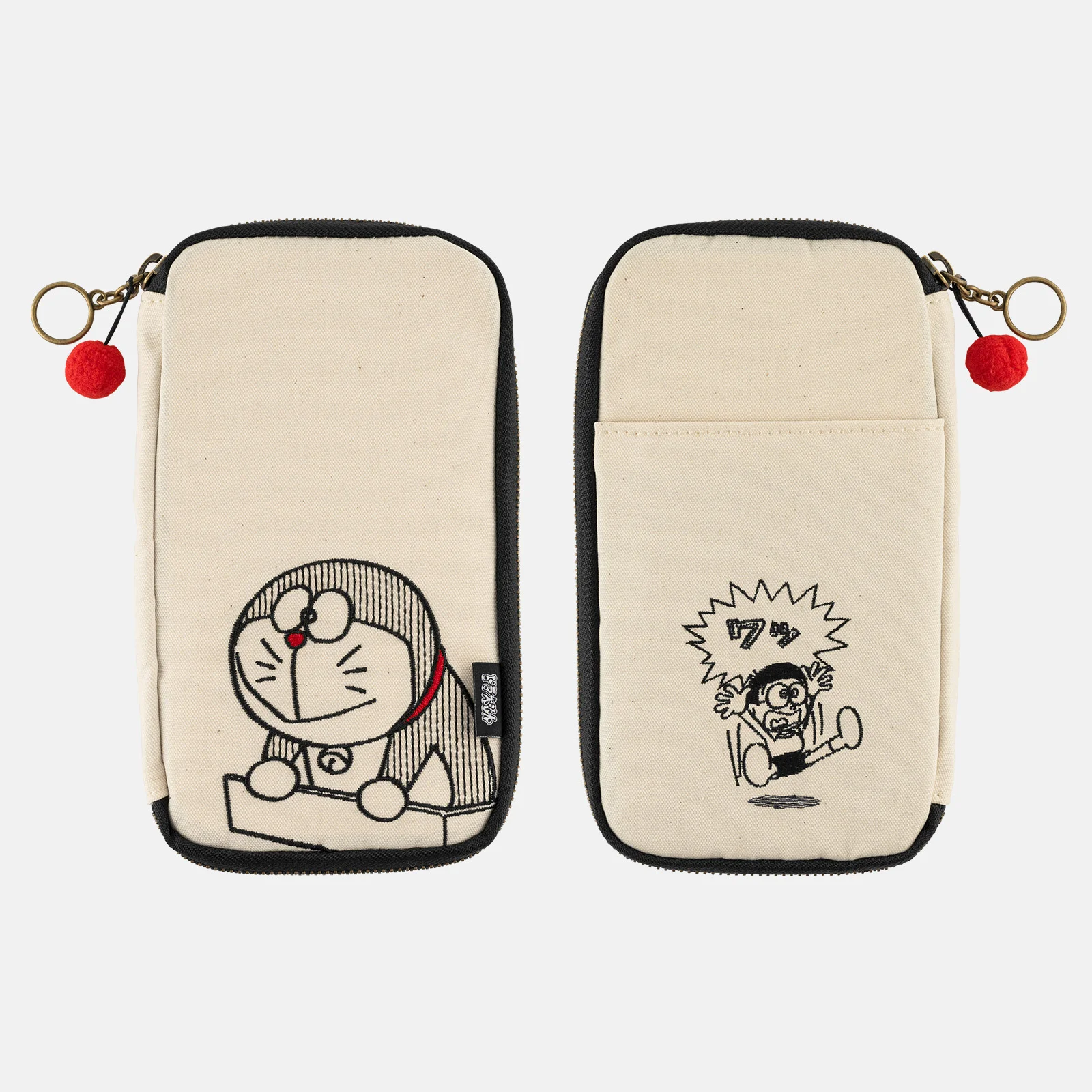 The outside uses a simple ecru canvas material, but open the pouch to reveal vivid Doraemon-like colors. The zipper pull is a round charm, just like Doraemon’s tail. The black tag with the words “Doraemon” printed in white adds an accent to the look.