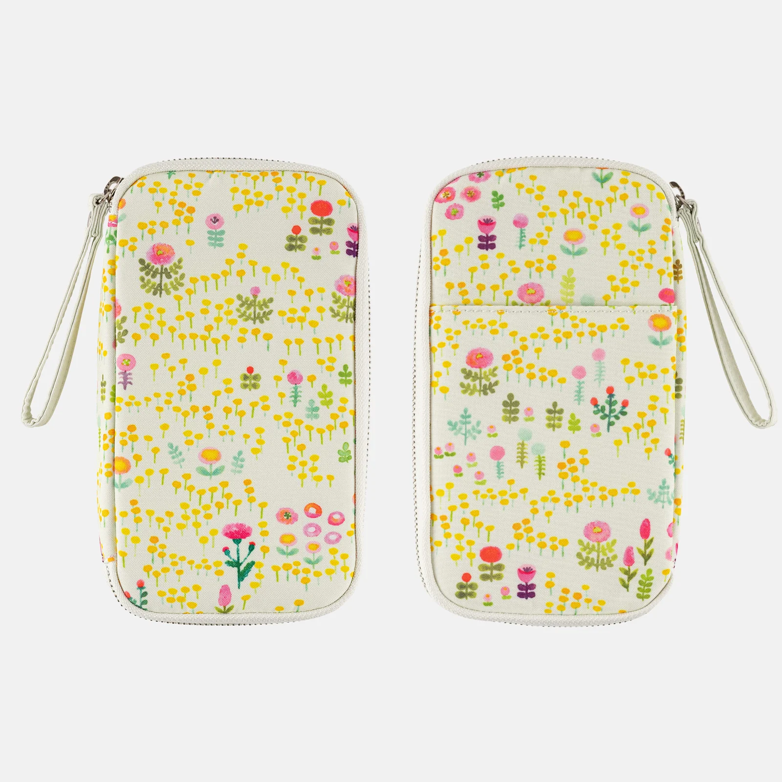 This printed fabric was illustrated by Aki Kondo, who is famous for creating picture books, coming up with the concept for Rilakkuma, and creating the characters Mofy the rabbit, woo and wah, and Ofuton-san. There’s a soft, mint blue background and a host of yellow and red flowers painted in watercolor to cheer you up. The interior is a vivid pink.