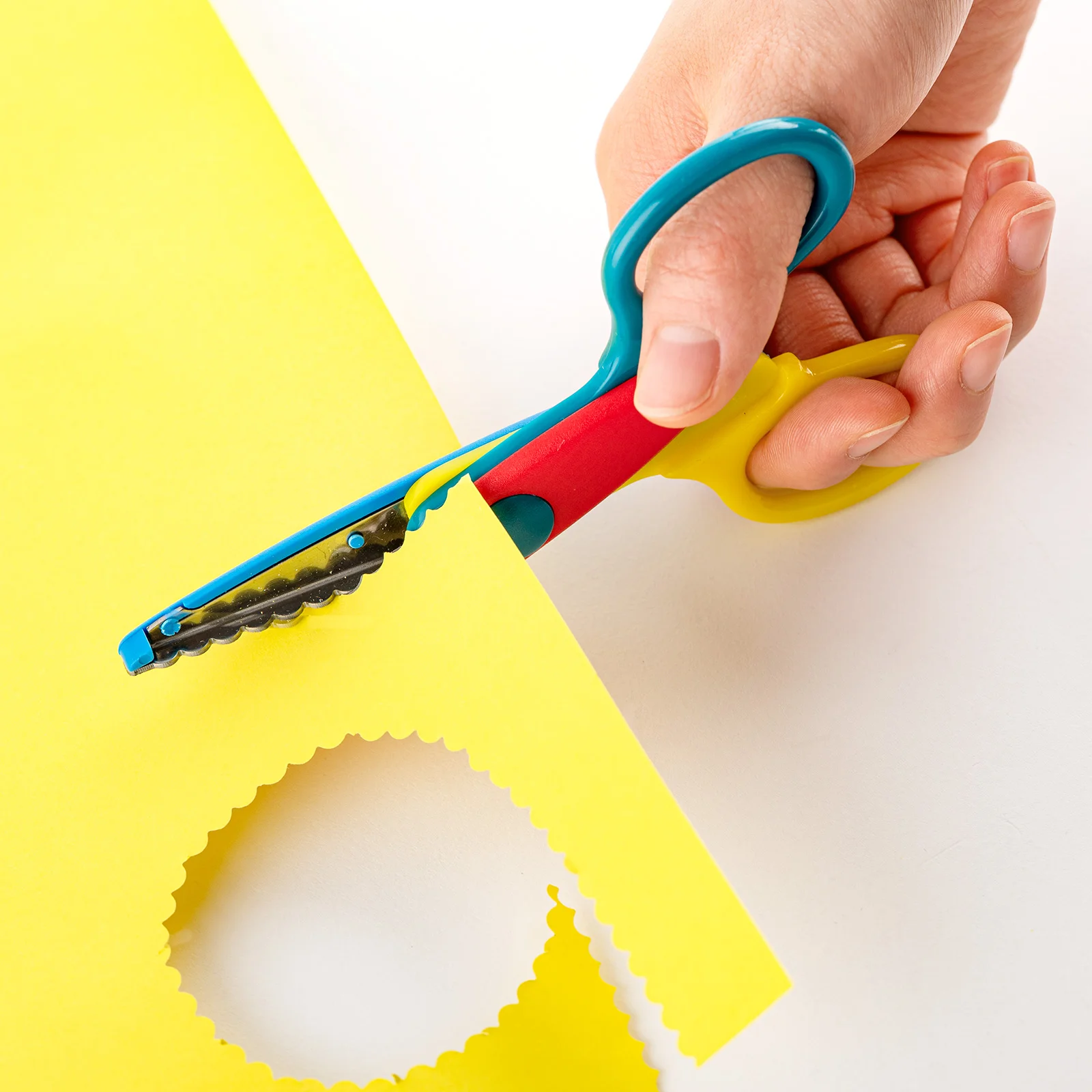 Splashes of red, yellow, blue, and green make up the body of these colorful scissors, which are lightweight and small enough for children to use. The wave-shaped blade of the scissors lets you cut patterns into the edge of papers. Use them to cut patterns into the tips of your sticky notes or add a flair to greeting cards and more.