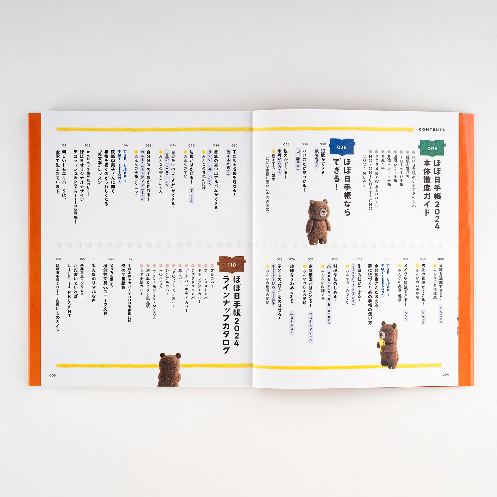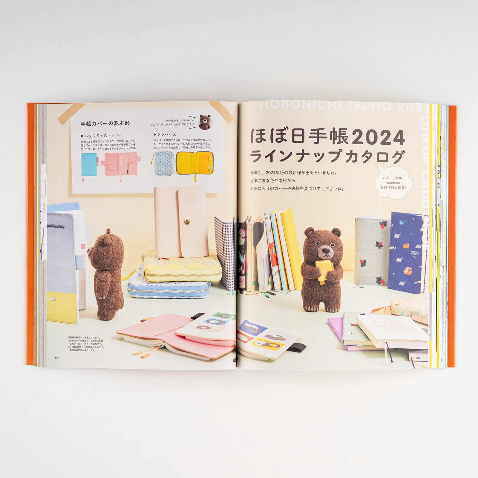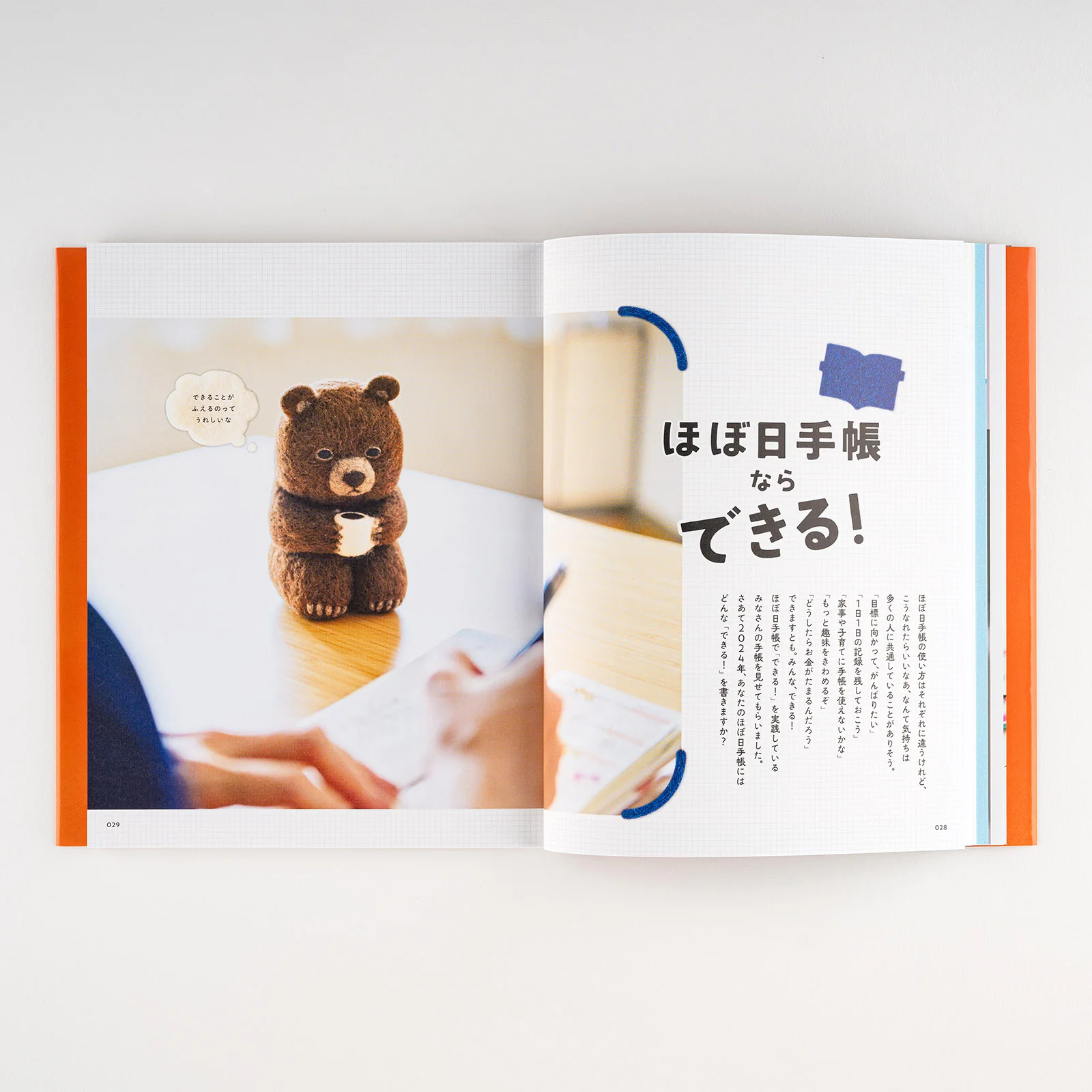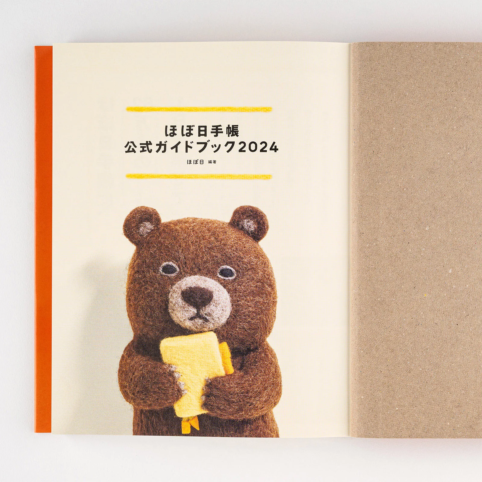 The bear holding the Hobonichi Techo on the guidebook cover was created by felt artist Sleepy Sheep. The bear has a faraway expression on its face, but as it hugs the Hobonichi Techo, it might be coming to feel like 2024 is a year of potential. The book turned out really cute, and is peppered with images of the bear and various items made of felt.