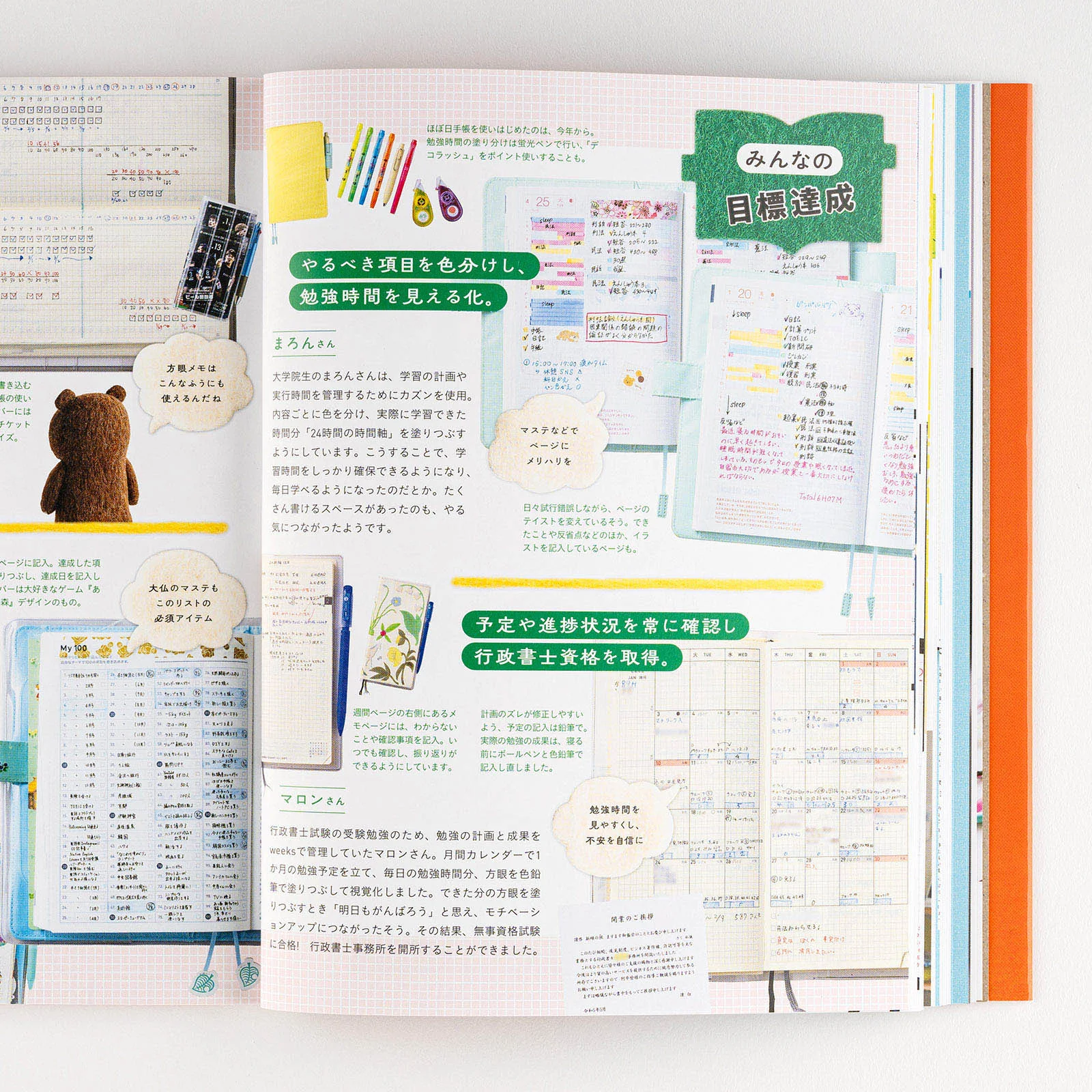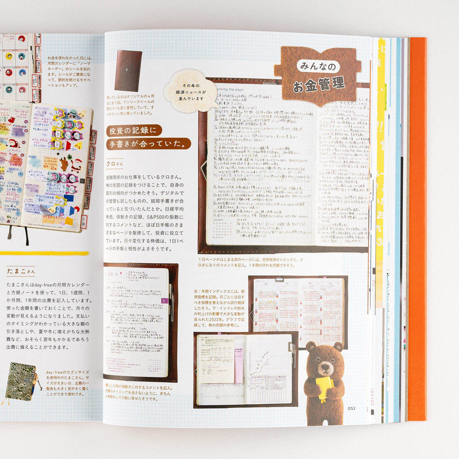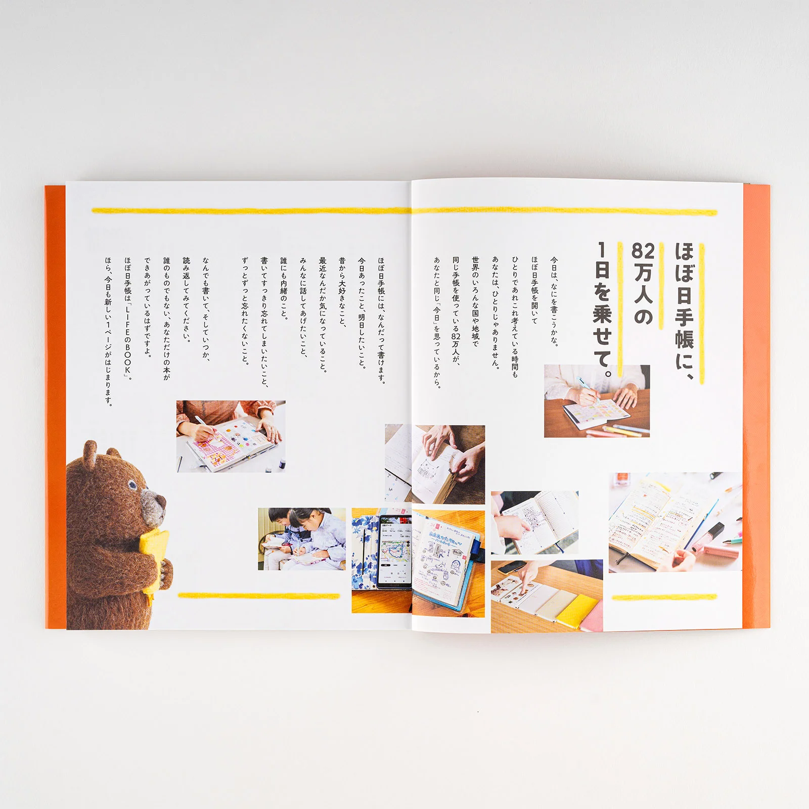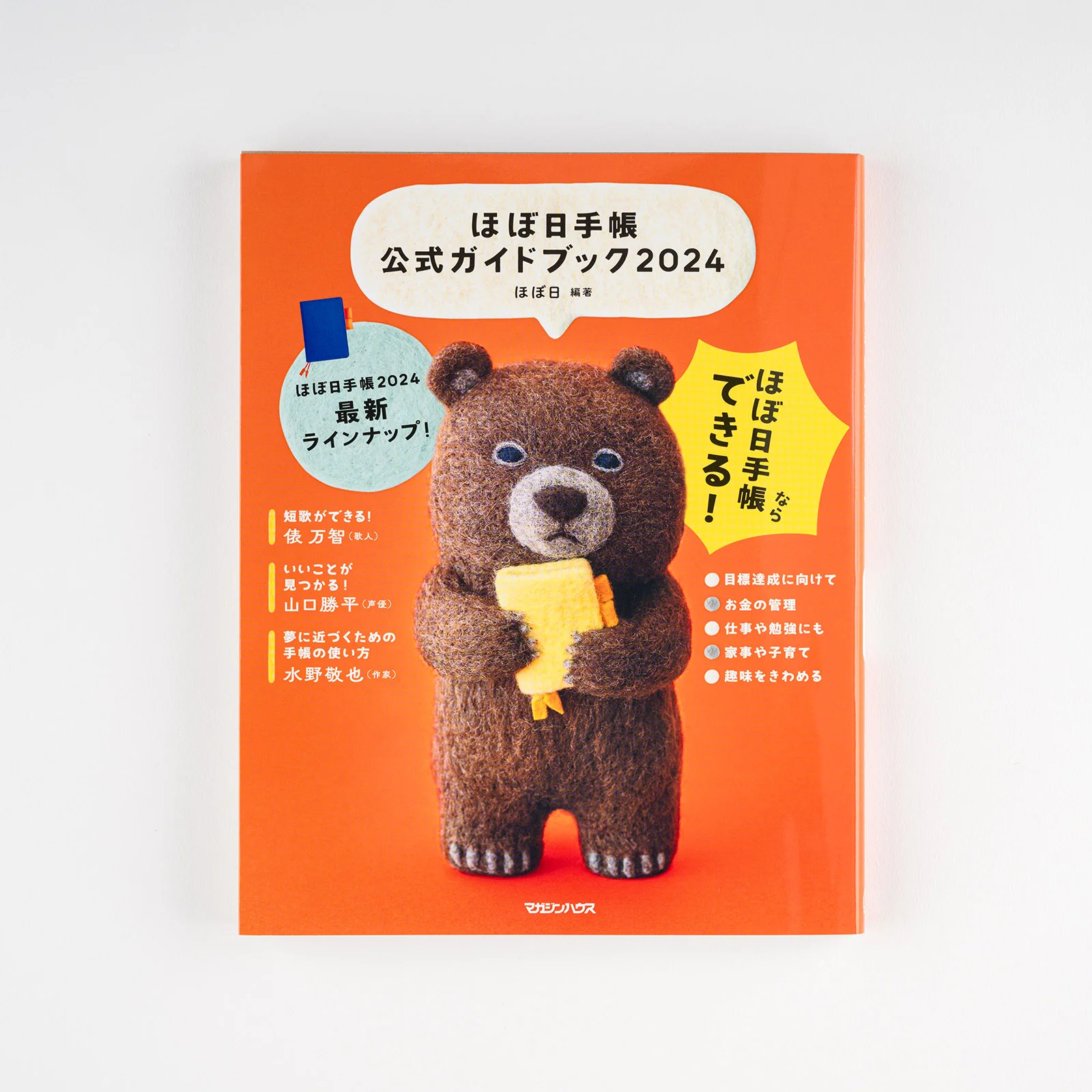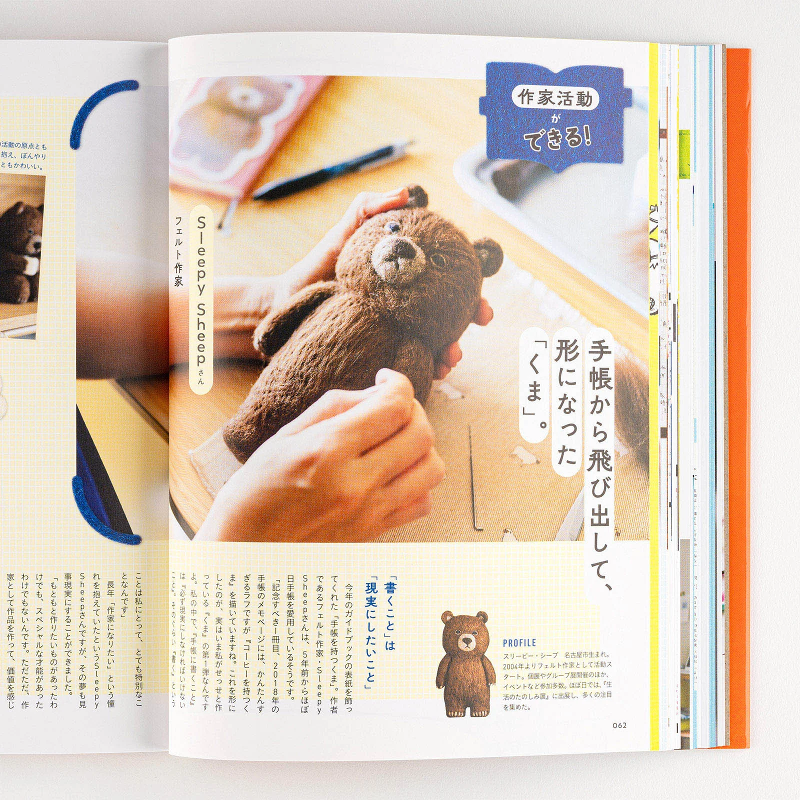 The bear holding the Hobonichi Techo on the guidebook cover was created by felt artist Sleepy Sheep. The bear has a faraway expression on its face, but as it hugs the Hobonichi Techo, it might be coming to feel like 2024 is a year of potential. The book turned out really cute, and is peppered with images of the bear and various items made of felt.