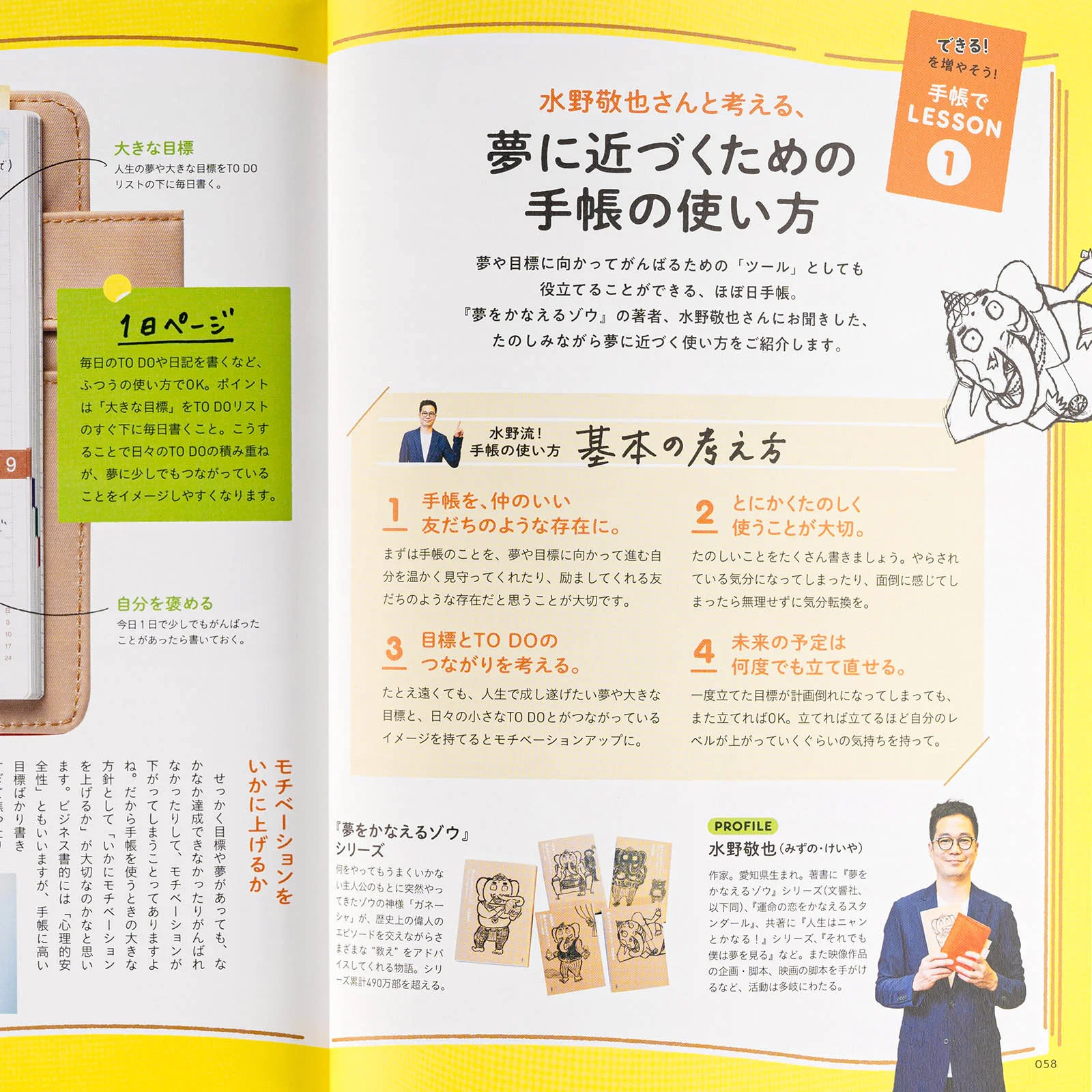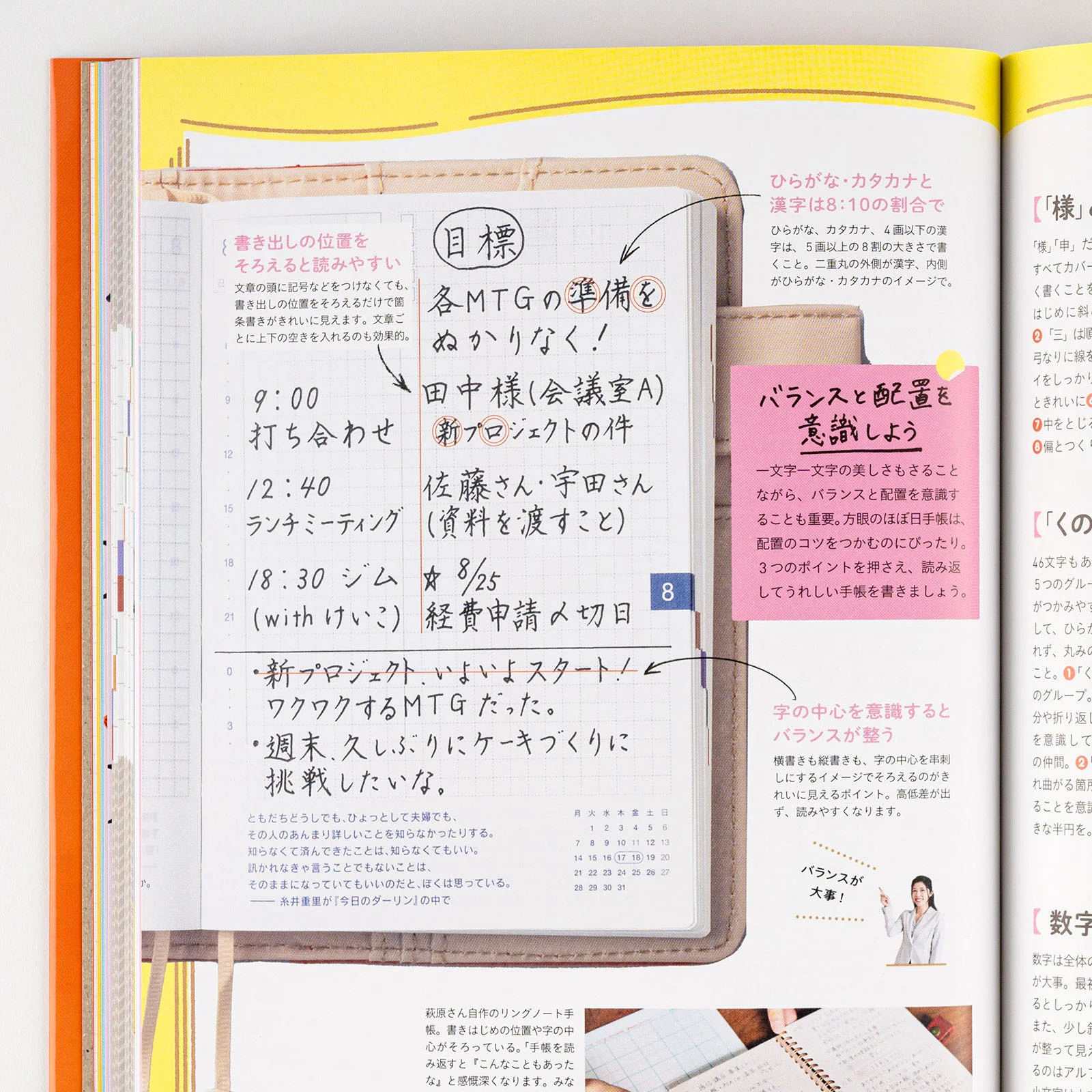 Keiya Mizuno, author of The Elephant that Makes Dreams Come True, teaches us how to use the techo to get closer to fulfilling our dreams. Kimiko Hagihara, a handwriting instructor, gives us a lesson on beautiful handwriting that makes it enjoyable to write in our techos. This guidebook is packed with information that makes using the Hobonichi Techo even more fun!