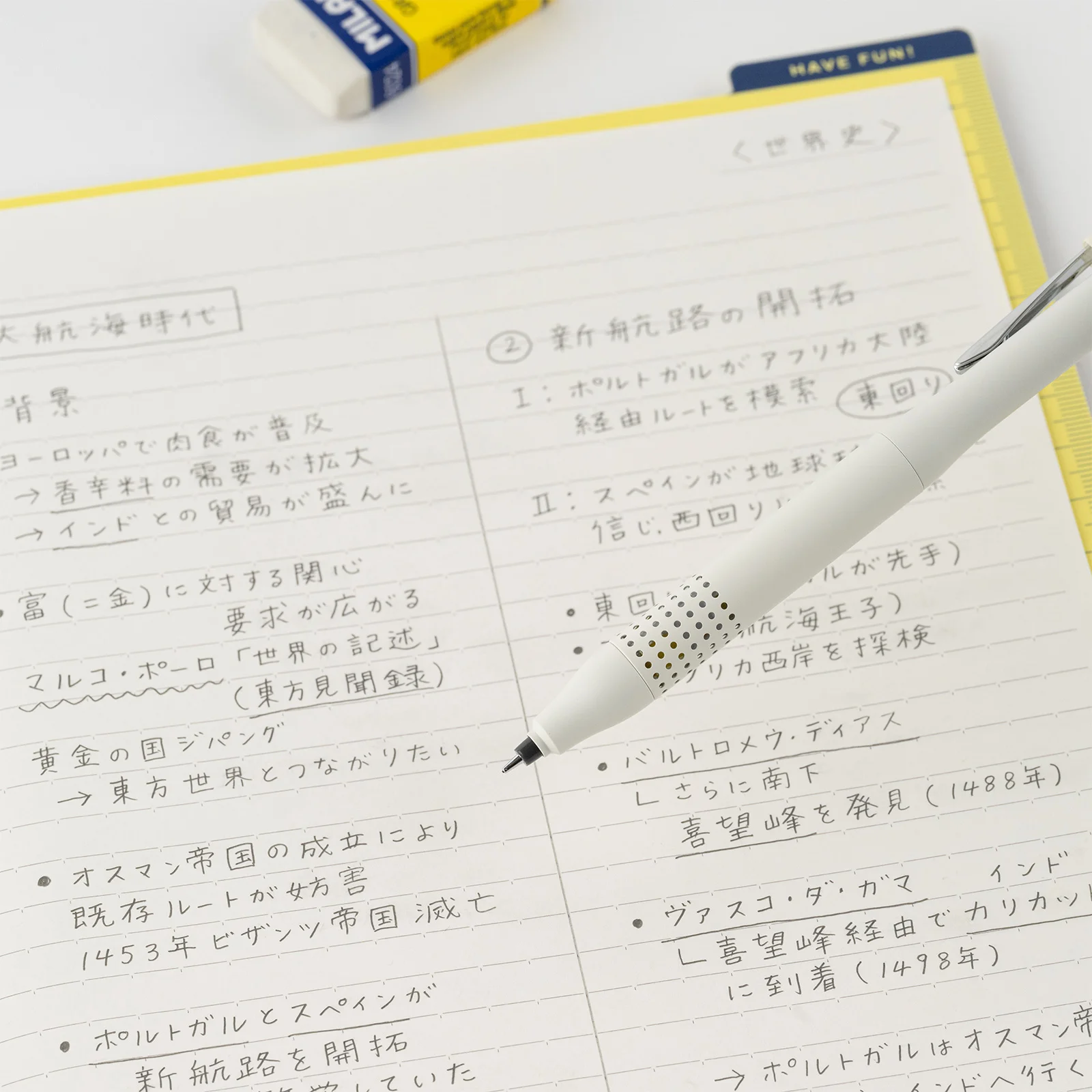 The “Slide Pipe” allows you to write without ejecting the lead from the tip, and makes it difficult to break the lead allowing you to continue writing for a long time with a single nock. It is convenient when you want to take a quick note or concentrate on writing.