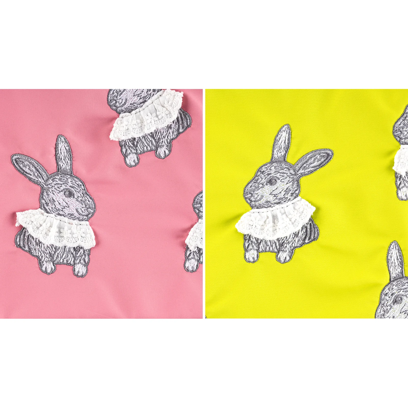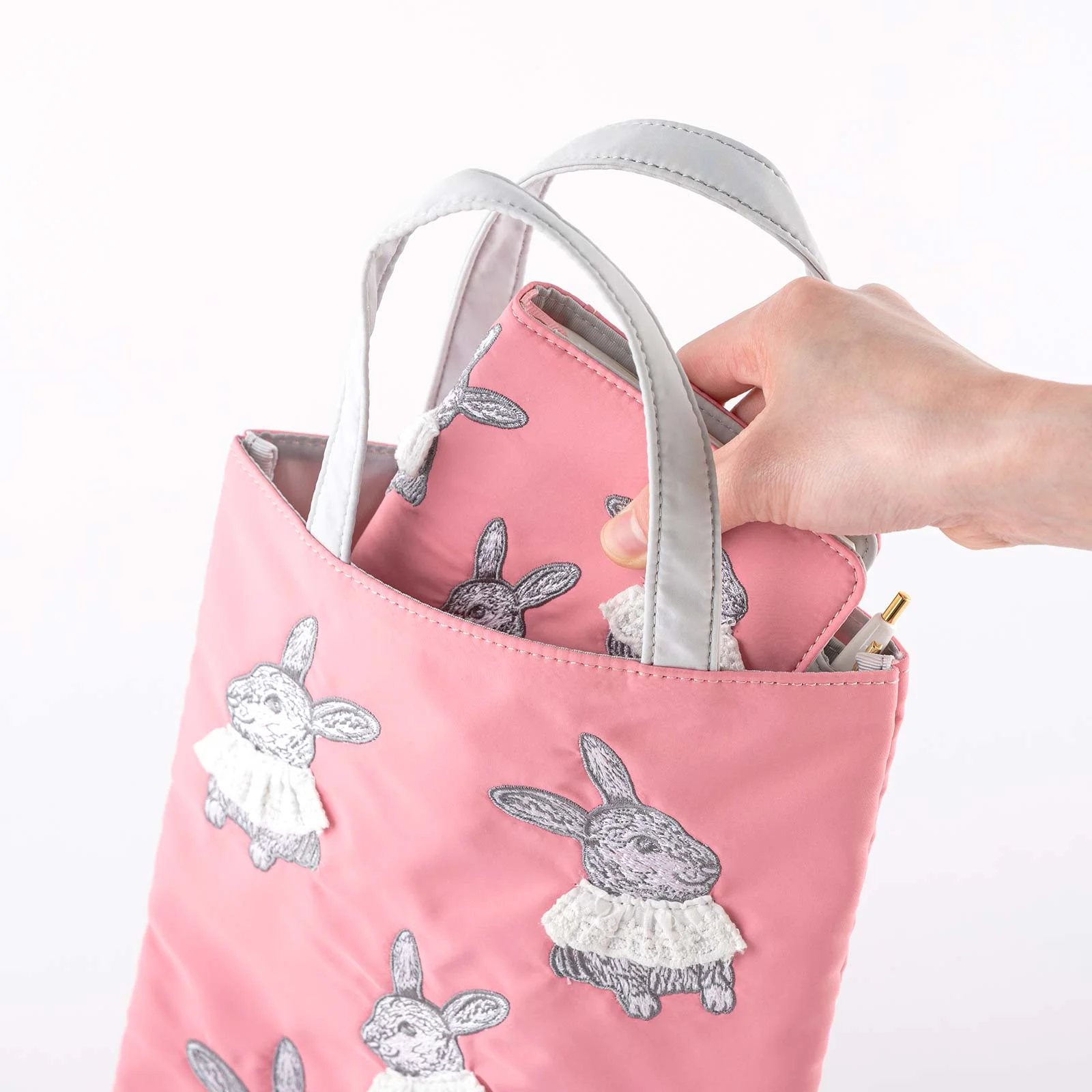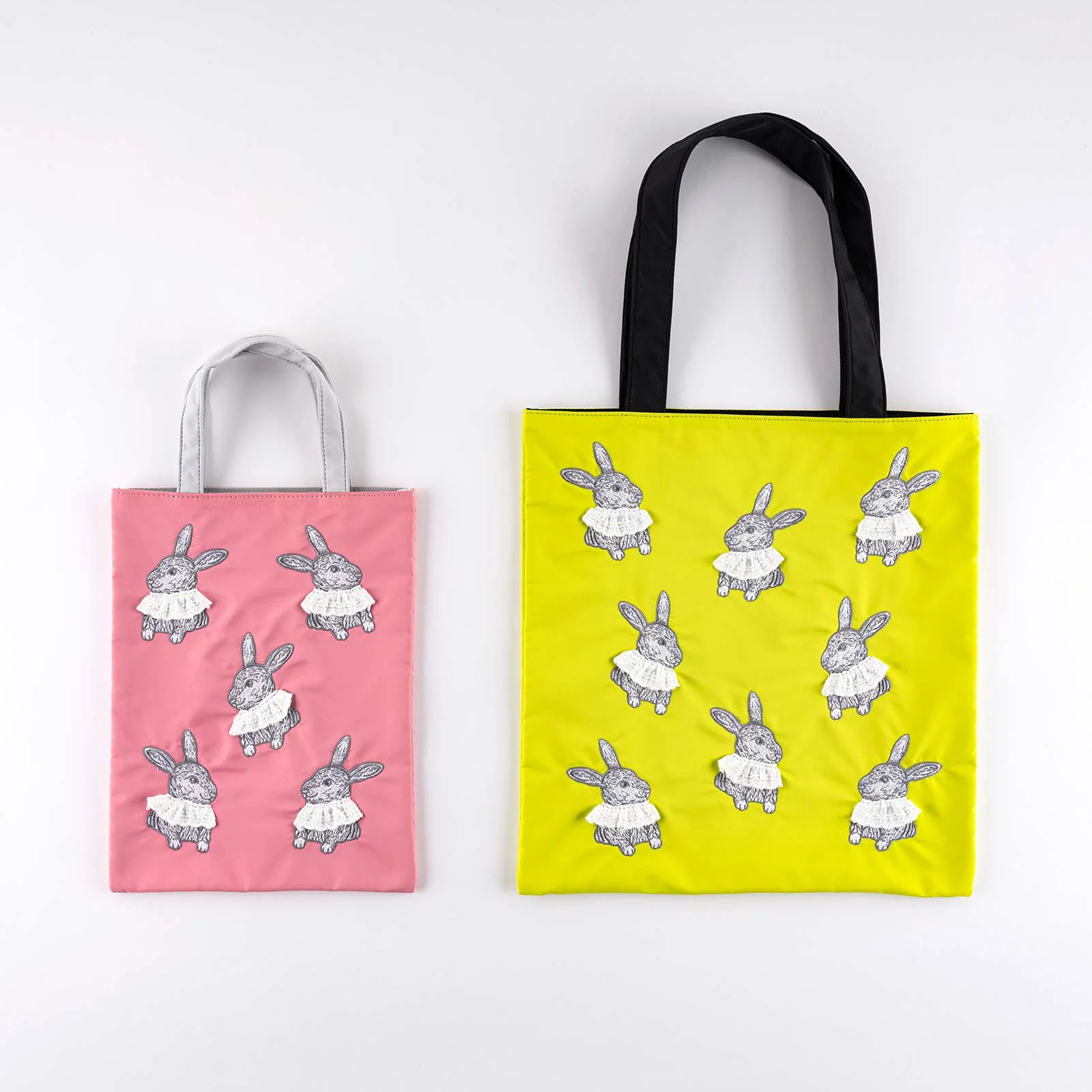 We made a simple tote bag to match the Candy Stripper techo cover Sweet Bunny. The textile has rabbits with their feet lined up embroidered all across it. Real cotton lace is used for their collars.
