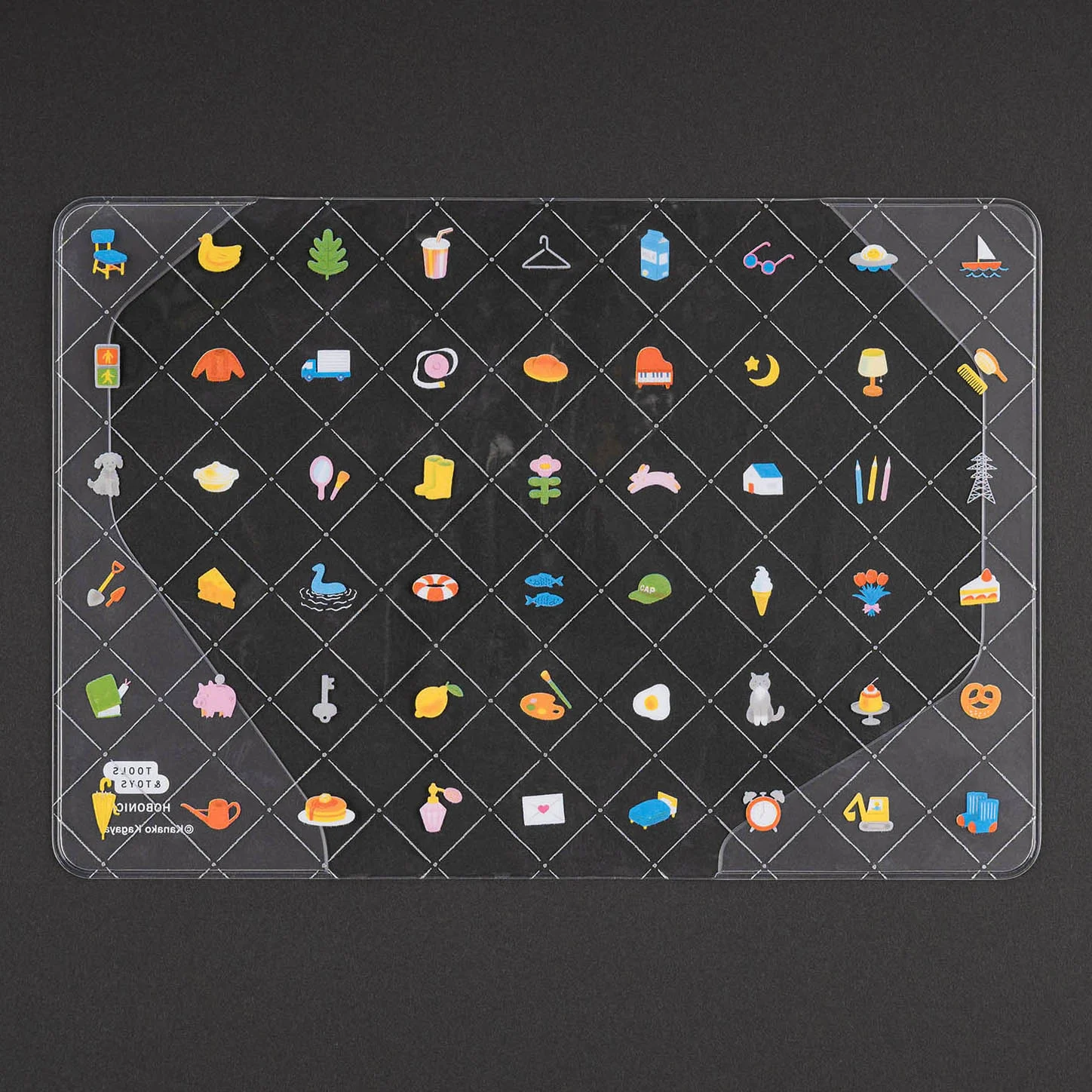 The theme for this design is “wrapping paper for your techo.” Drawn on the cover are many motifs that we often see in our day-to-day activities, from delicious food such as puddings and fried eggs to cute little things like dogs and cats, gloves, keys, steel towers, and traffic lights.