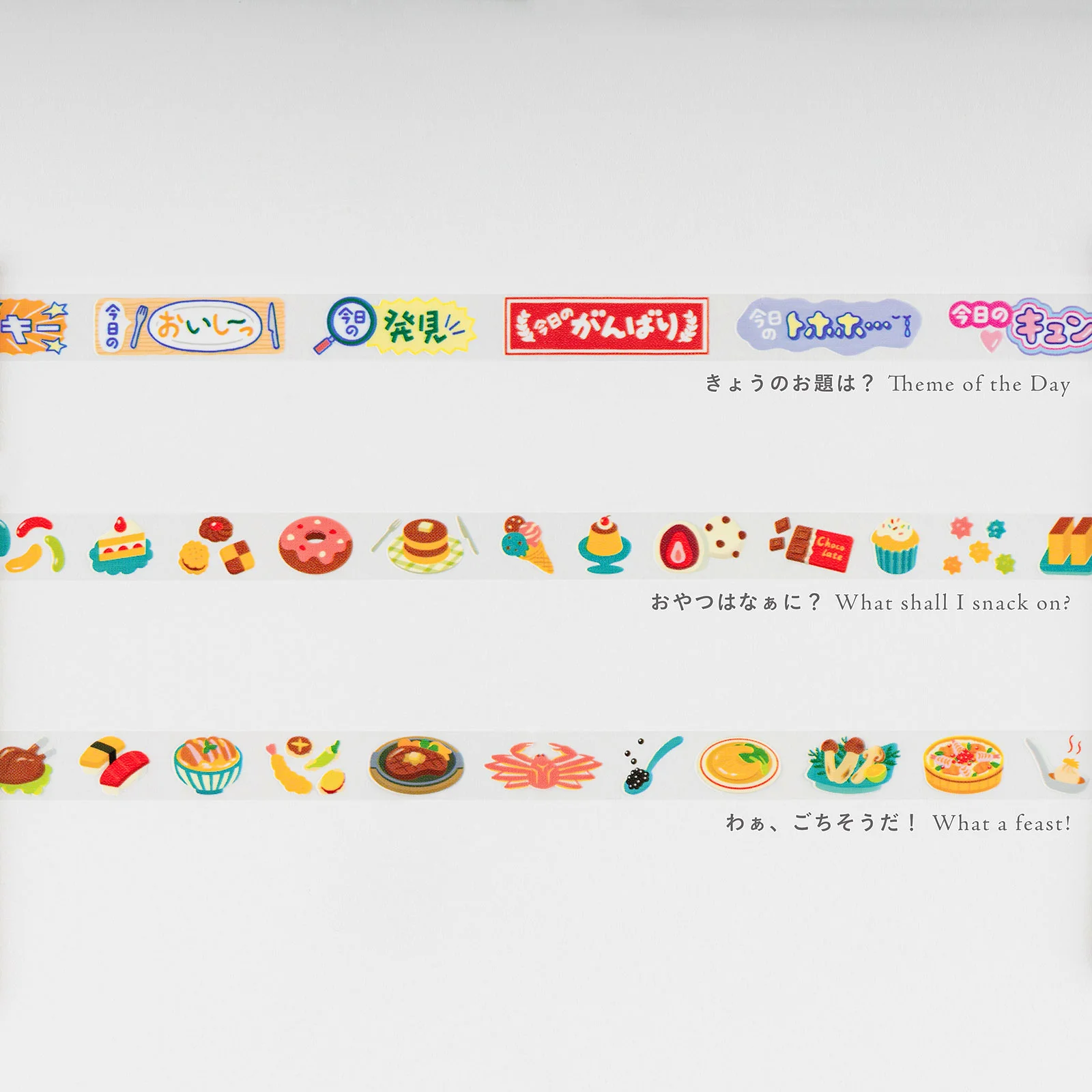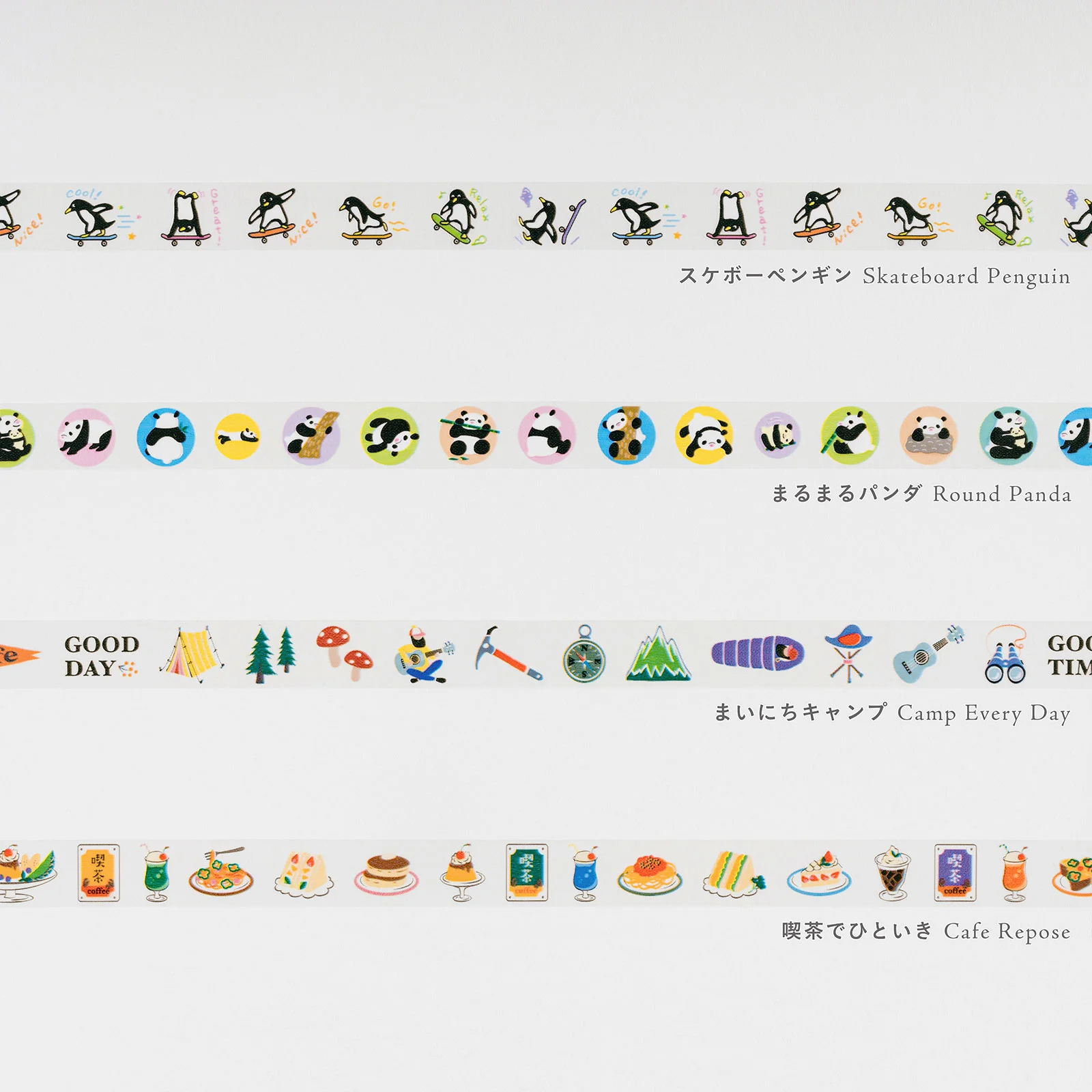 This year, we’re pleased to bring you Deco Rush tape with original designs for the Hobonichi Techo. “Theme of the Day” contains topics for you to write about, “What shall I snack on?” contains popular snacks and foods, and “What a feast!” has an array of delicious meals. Then we’ve got some designs based on techo covers. These include “Skateboard Penguin,” “Round Panda,” “Camp Every Day,” and Cafe Repose.” That makes a total of seven designs to choose from. Each tape roll is 10 mm wide.