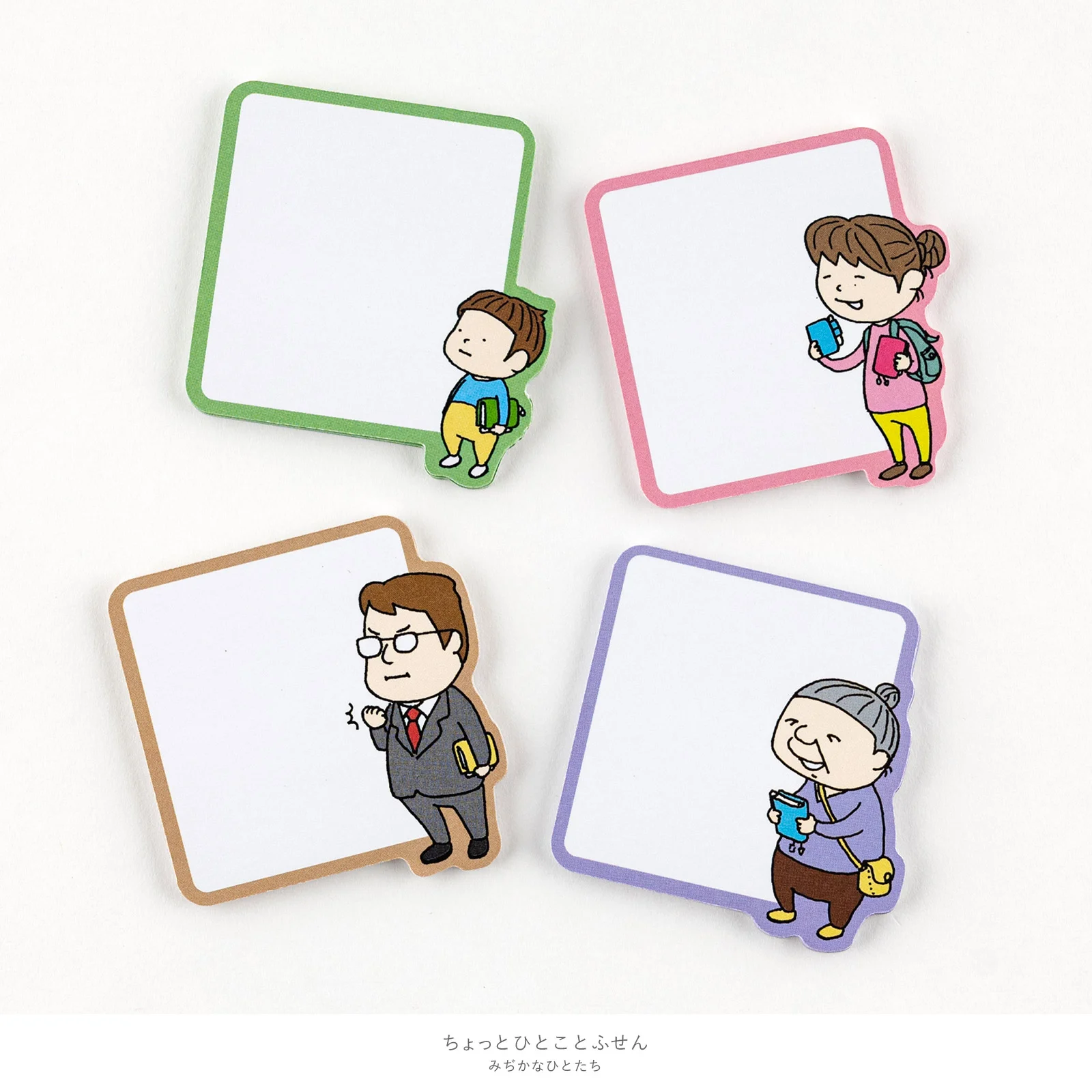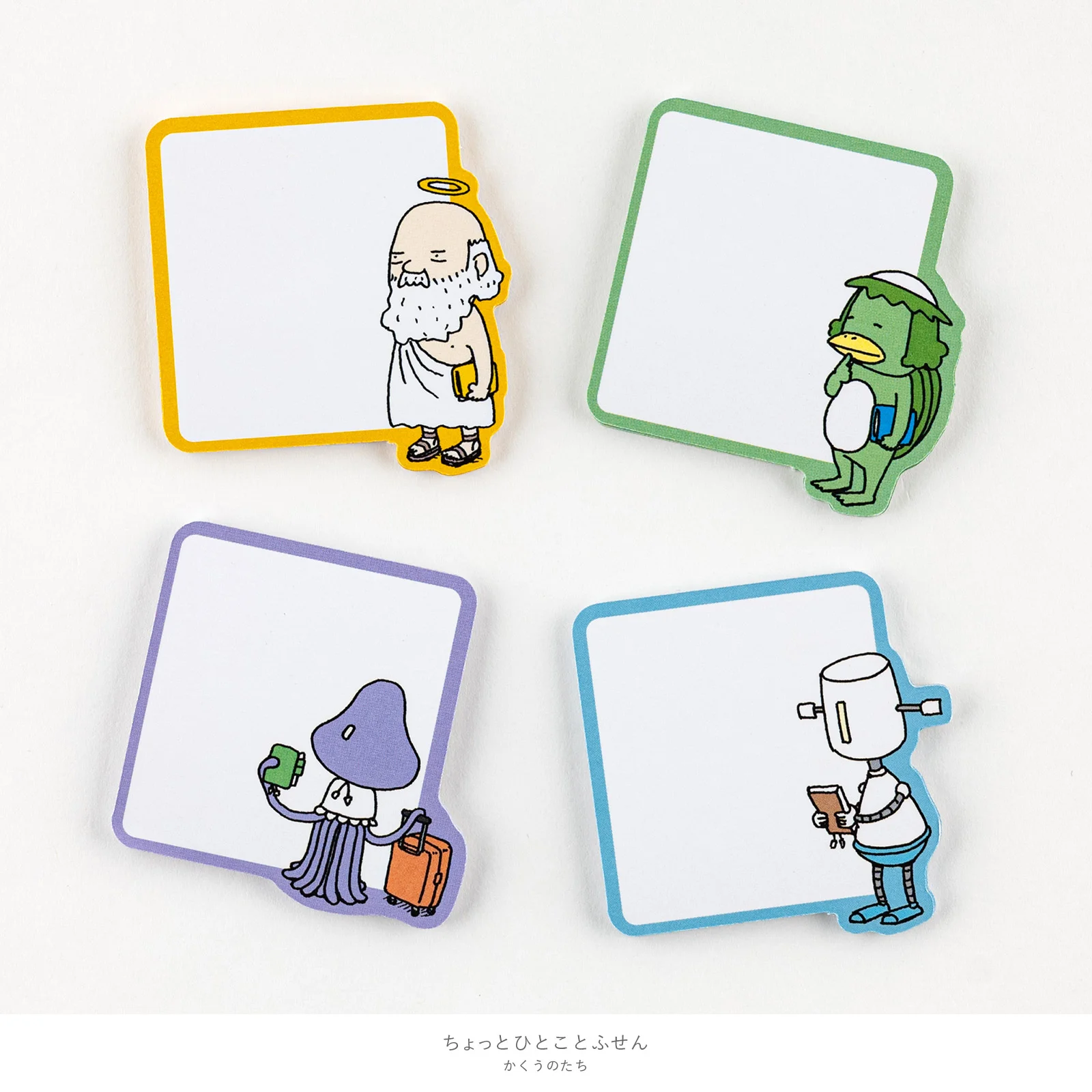 We asked children’s book author and illustrator Shinsuke Yoshitake to create illustrations for the Hobonichi Techo 2018 leaflet, and we’ve brought those illustrations back for use with these sticky notes. They have the special touch of each character holding a Hobonichi Techo.