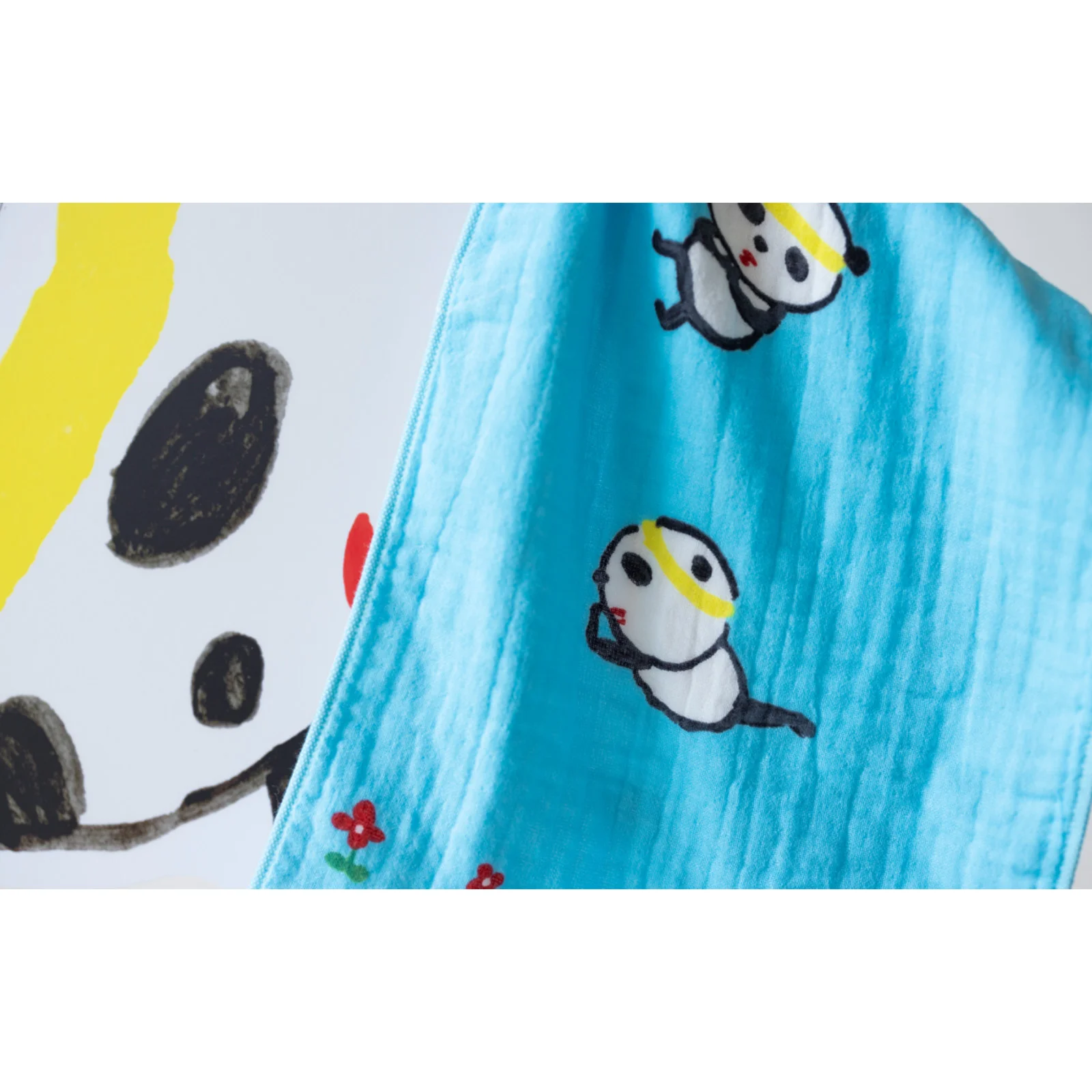 The gauze colors are sky blue for the Hand Towel, pink for the Kitchen Towel, and yellow and white for the Small Fingertip Towels, with light gray pile fabric on the other sides. The sporty and bright colors are great for both children and grown-ups.