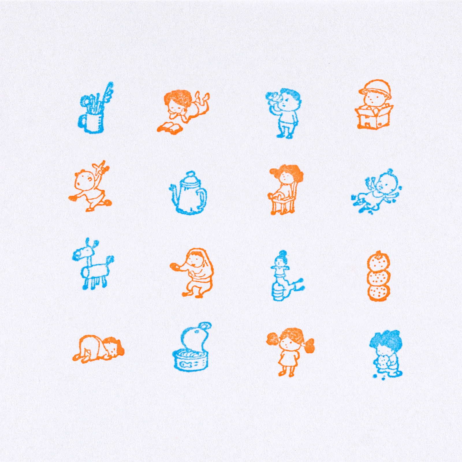 We asked children’s book author and illustrator Shinsuke Yoshitake to create illustrations of children for the Hobonichi Techo, and these stamp sets use those illustrations.