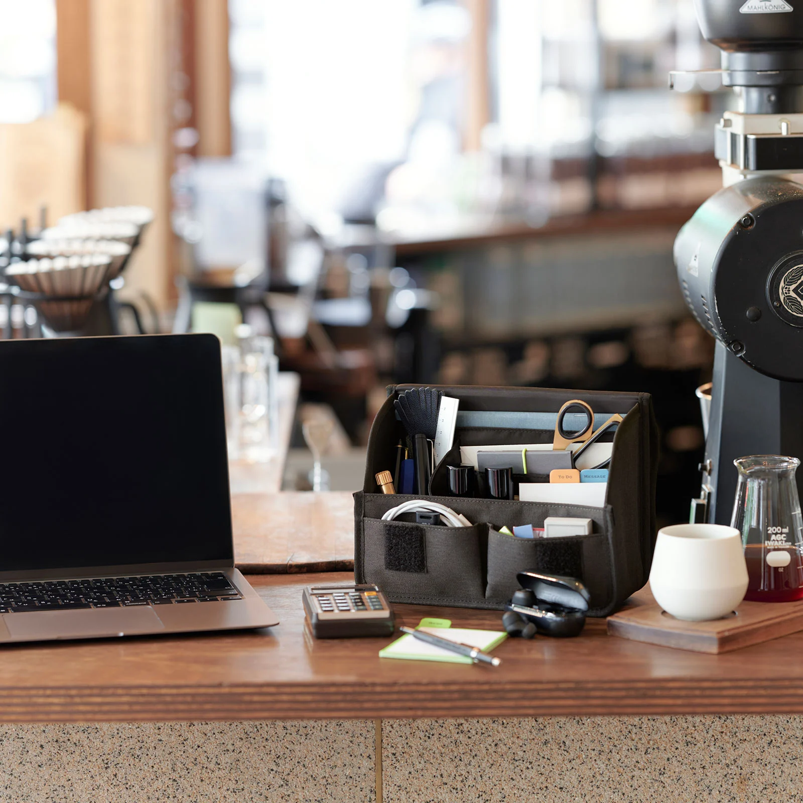 The interior also has pockets of various sizes that can store items based on their size and shape. The largest pocket is long enough to hold a memo pad or ruler. The small pocket can store sticky notes, cards, stickers, and other slim objects. The left pocket can hold pens.