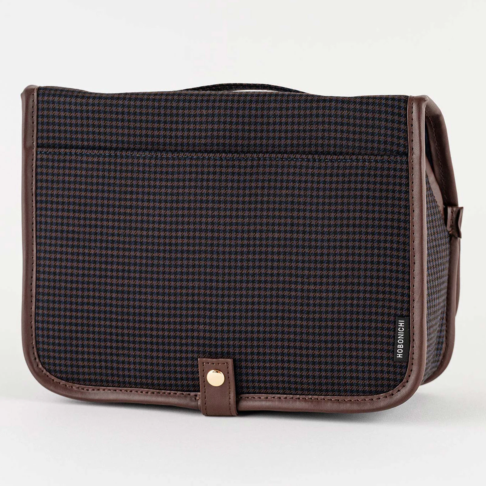 Dark Plaid is a plaid design that pairs navy and brown. The pouch has deep brown piping, and the interior is navy. This creates a chic, mature look.
