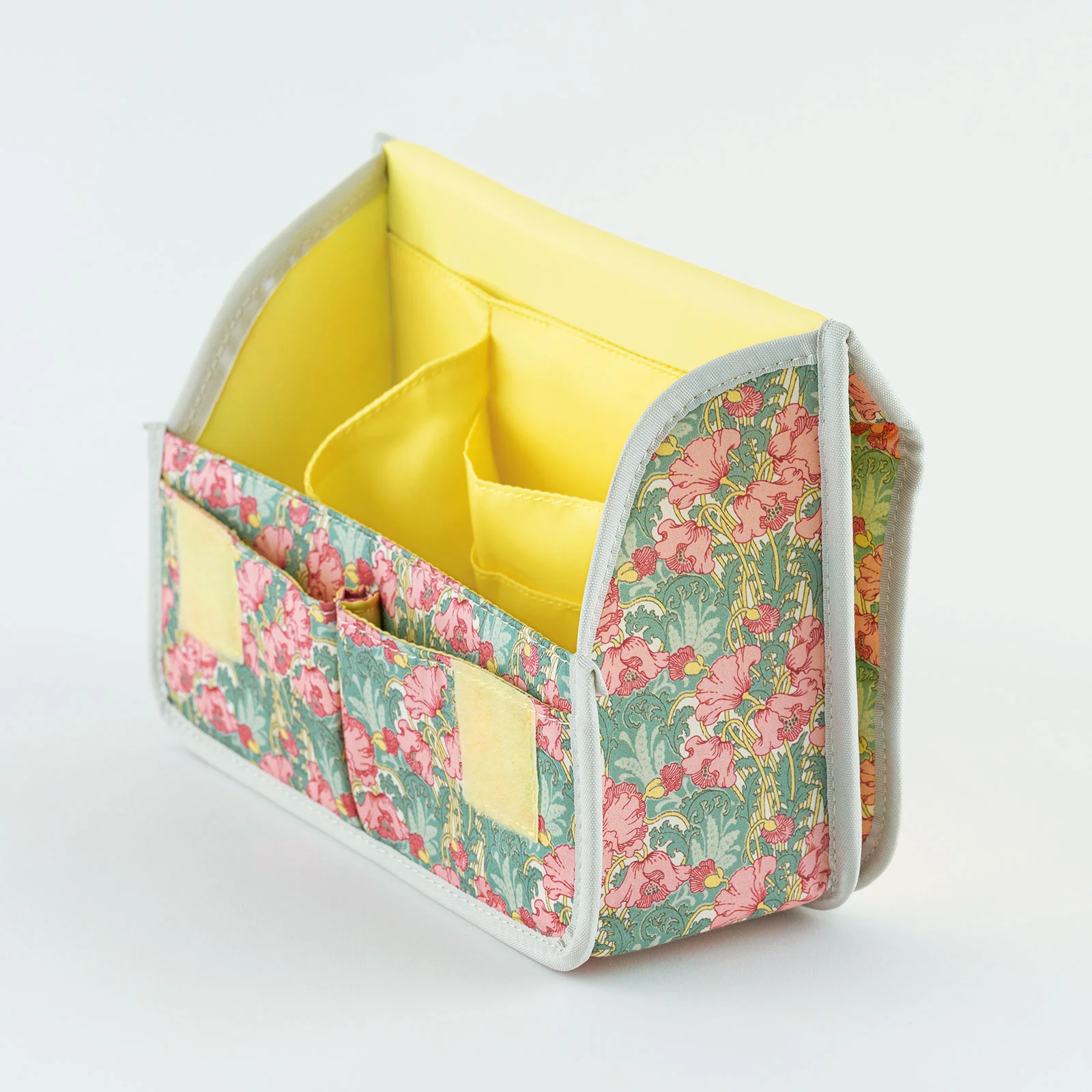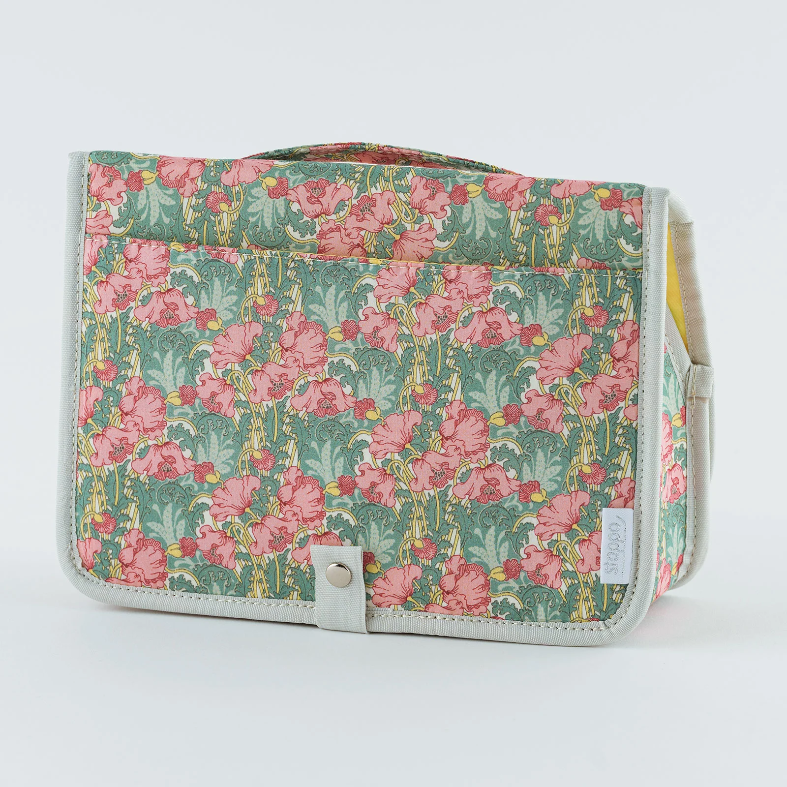 “Liberty Fabrics: Clementina” uses the same textile as the Weeks techo cover for Hobonichi Techo 2023. This textile features a design of a cluster of poppies, representative of the Art Nouveau period, characterized by fluid lines. The beautiful design gives an elegant and supple impression. The piping is a faintly tinted pale green, and the inside interior is yellow.