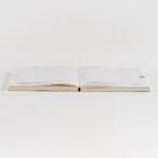 The book has the same thread-stitch binding as a dictionary, allowing it to lay flat open for comfortable writing. It stays flat even if you don’t hold it down.