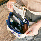 When you’re only stepping out for a moment, we recommend taking the Anytime Tote Petit. The Drawer Pouch Ané, which you can use as a wallet or a carrying case for small items, fits perfectly both vertically or horizontally in the tote.