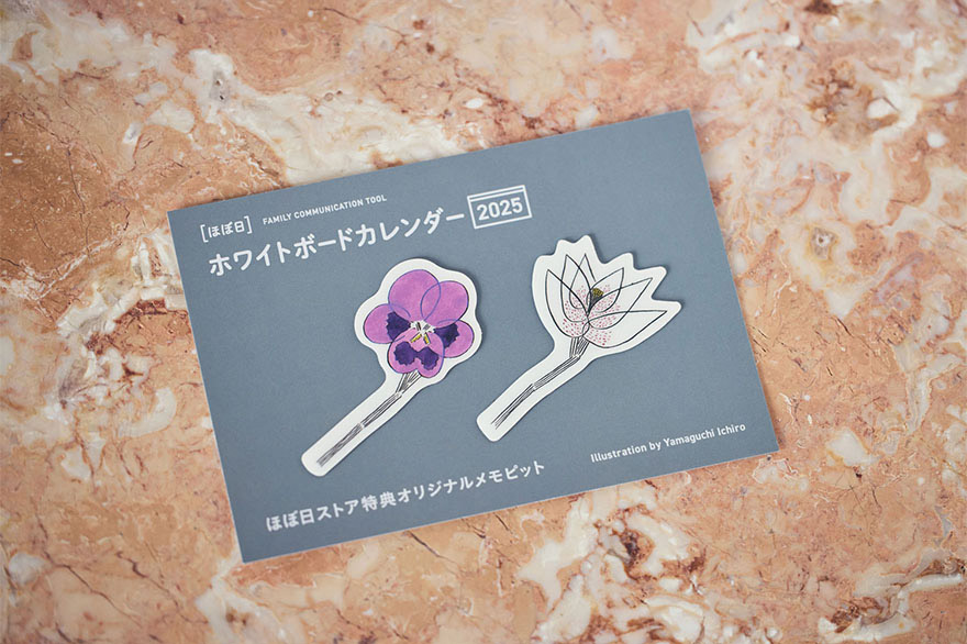 In the 20th year since the creation of the Whiteboard Calendar, the 2025 edition of the monthly numbers has been beautifully illustrated with colorful flowers by artist Ichiro Yamaguchi.