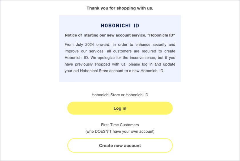 We apologize for the inconvenience, but please update your old Hobonichi Store account to a new Hobonichi ID.