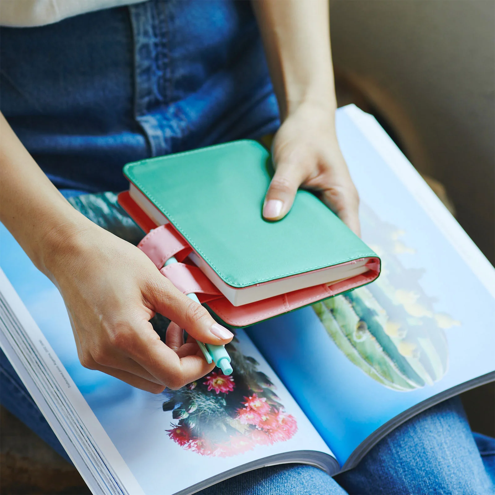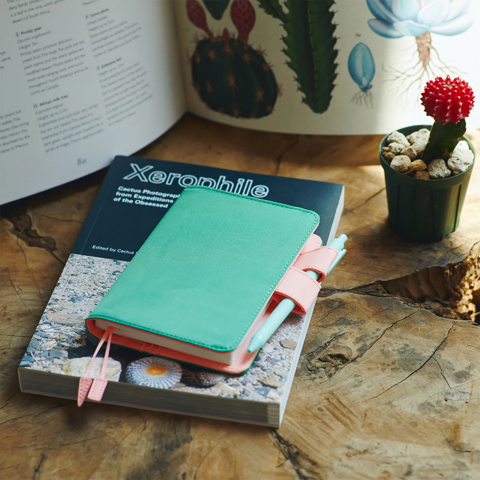 Cactus Flower pairs a deep, blue-tinted green exterior with a golden pink interior to evoke the image of a cactus with a pretty flower blooming on top. Carrying this cover can give you that refreshing feeling you get when interacting with nature.
