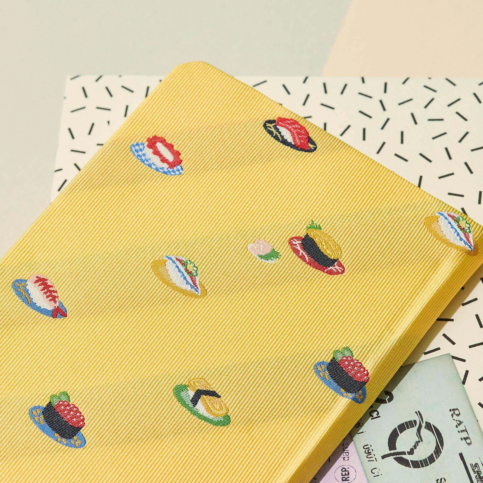 The Sushi pattern has many sushi lined up on a bright yellow cover. The pattern of the plates, which match the sushi items, is also expressed in detail with the necktie weave. The fabric used for neckties has a weave texture that is pleasant to the touch and has an appealing silky luster.
