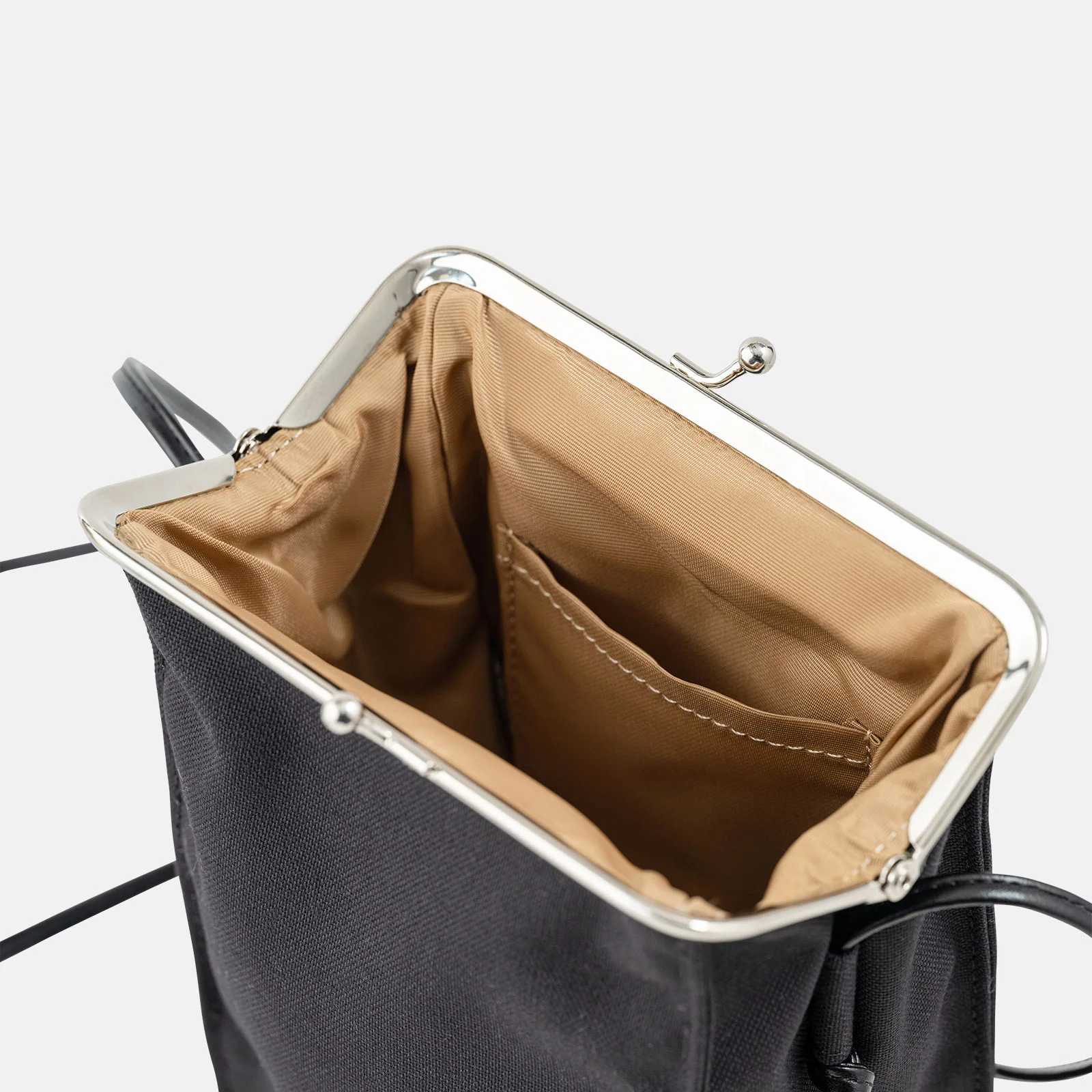 This design features a black cotton material that matches well with any other belongings or bags, and contains a beige interior to complete its nice, subtle look. It has a black shoulder strap, and the kiss lock clasp is in silver.
