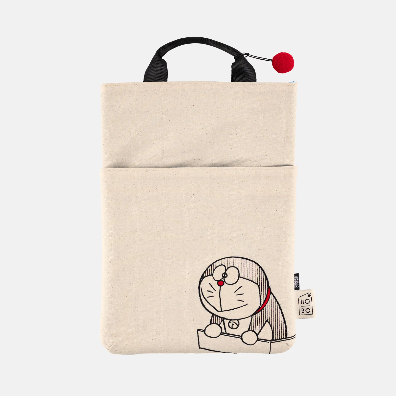The outside uses a simple ecru canvas material, but open the bag to reveal vivid Doraemon-like colors. The handle is a black nylon belt that’s thick enough to hold comfortably. The bag also contains a round charm to evoke Doraemon’s tail. Attached to the bag is a black tag with the logo “Doraemon” in white for a nice accent.
