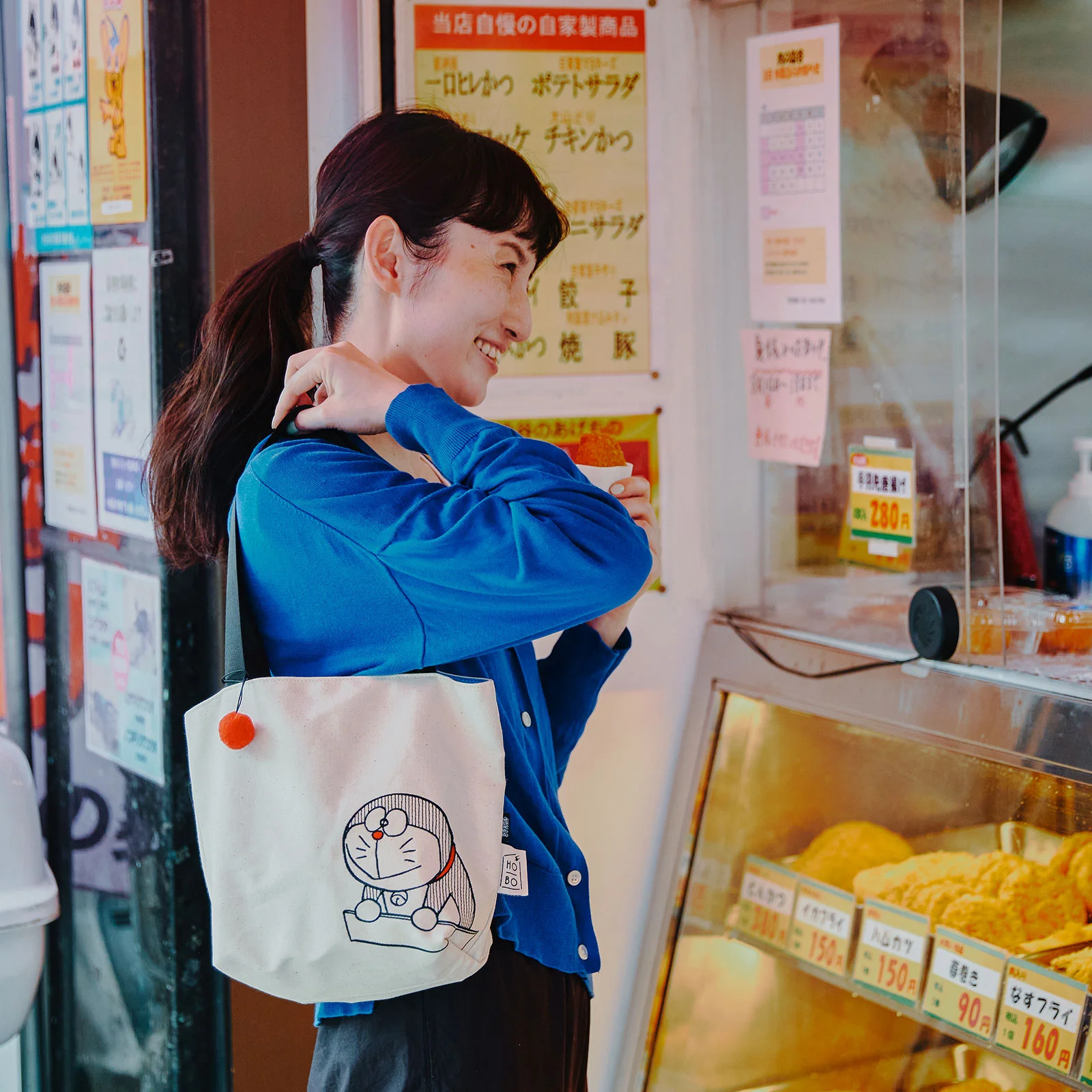 The outside uses a simple ecru canvas material, but open the bag to reveal vivid Doraemon-like colors. The handle is a black nylon belt that’s thick enough to hold comfortably or easily drape over your shoulder. The bag also contains a round charm to evoke Doraemon’s tail. Attached to the bag is a black tag with the logo “Doraemon” in white for a nice accent.