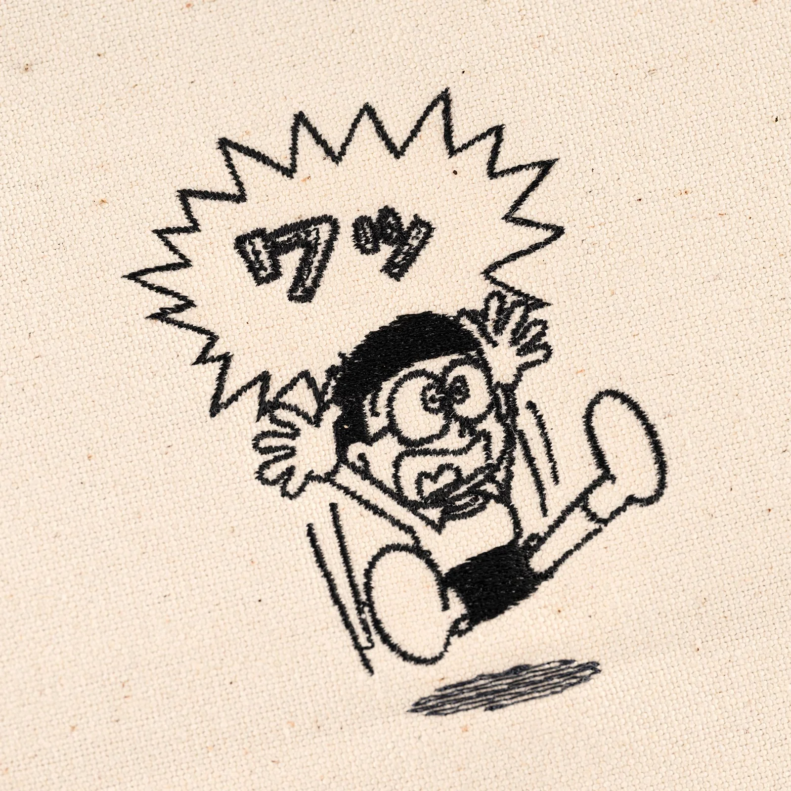Doraemon rides on a time machine from the 22nd century and saves Nobita with various secret tools pulled out from his “4D pocket.” This tote bag uses embroidery to depict the scene in the manga where Doraemon appears for the very first time. The color scheme uses black and white, creating a chic look.