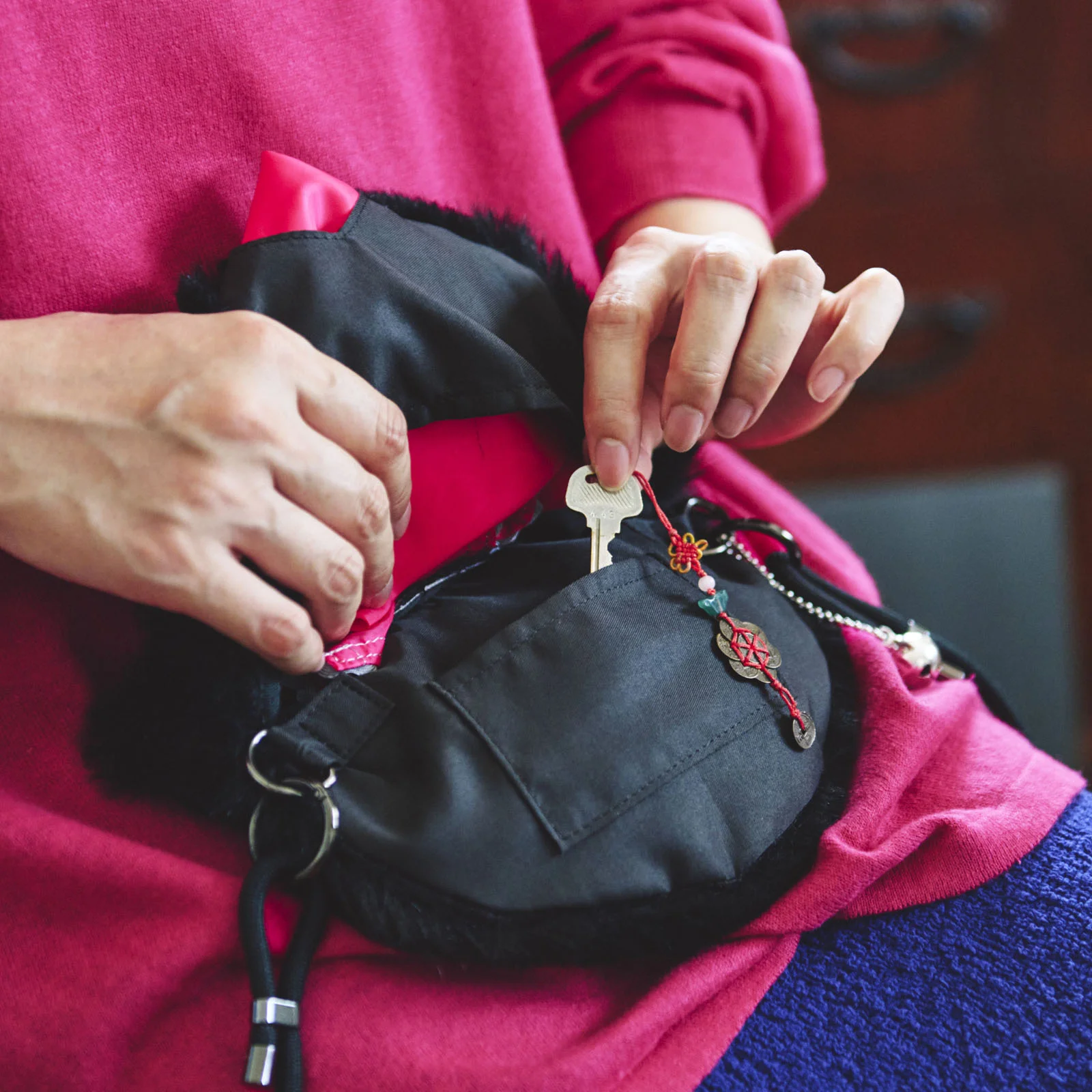 Inspired by the bell on a cat’s collar, the pouch also has a silver bell that jingles, adding a playful touch. The bell attaches with a ball chain, so you can remove it whenever you like.