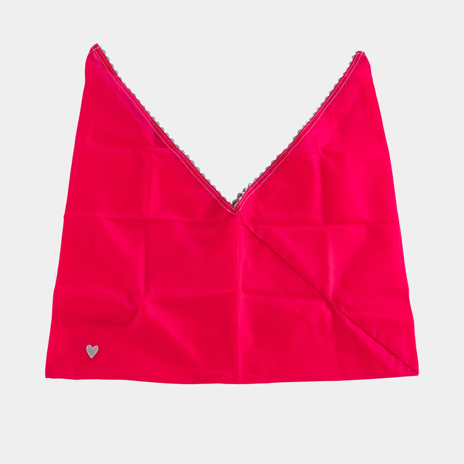The reusable bag is in the style of a traditional Azuma bag, which can be tied at the ends to make a loop for carrying. The edges are trimmed with wavy tape, and there’s a small heart embroidered with gray thread as a charming accent.