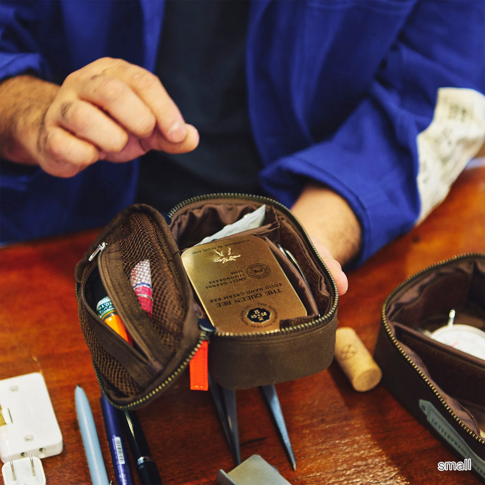 “Drawer Pouch of a ◯◯” is a series of pouches we created by teaming up with people in various industries to observe their own actual drawers and then create a Drawer Pouch from scratch by deciding the size, shape, and materials.