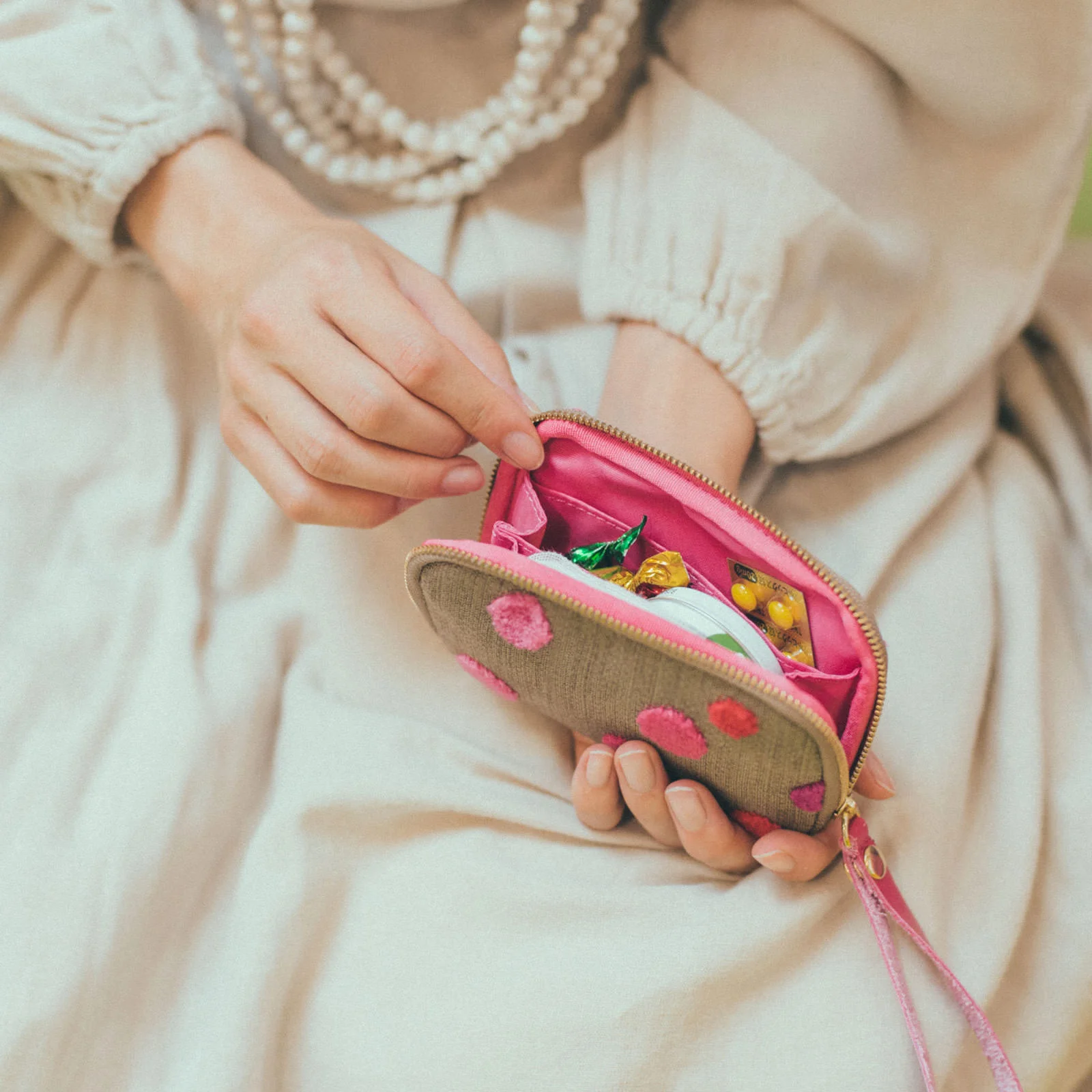 The polka dots have dynamic shapes to them, as if they were drawn freehand, and their texture is pleasing to the touch. There’s a warmth to the textile that doesn’t detract from the gorgeous look. The interior and hand strap are both hot pink.