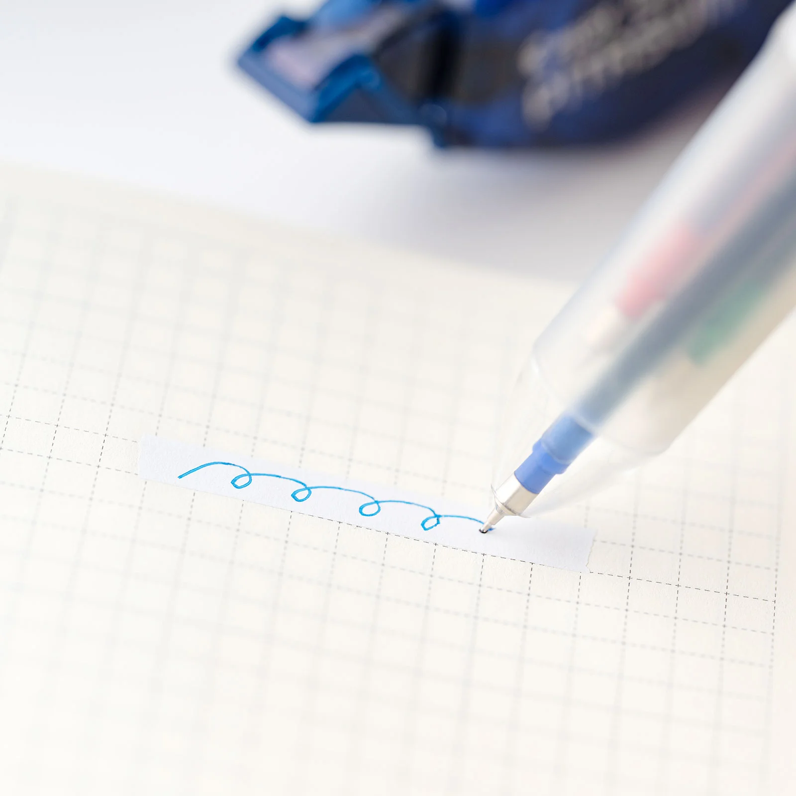 The head uses a rubber material and adopts a swing mechanism that allows it to move flexibly, ensuring the tape adheres firmly to the paper. The tape won't wrinkle and will be applied neatly. Additionally, even if you write on top of the tape using a pen with a thin pen tip, the tape is less prone to coming off.
