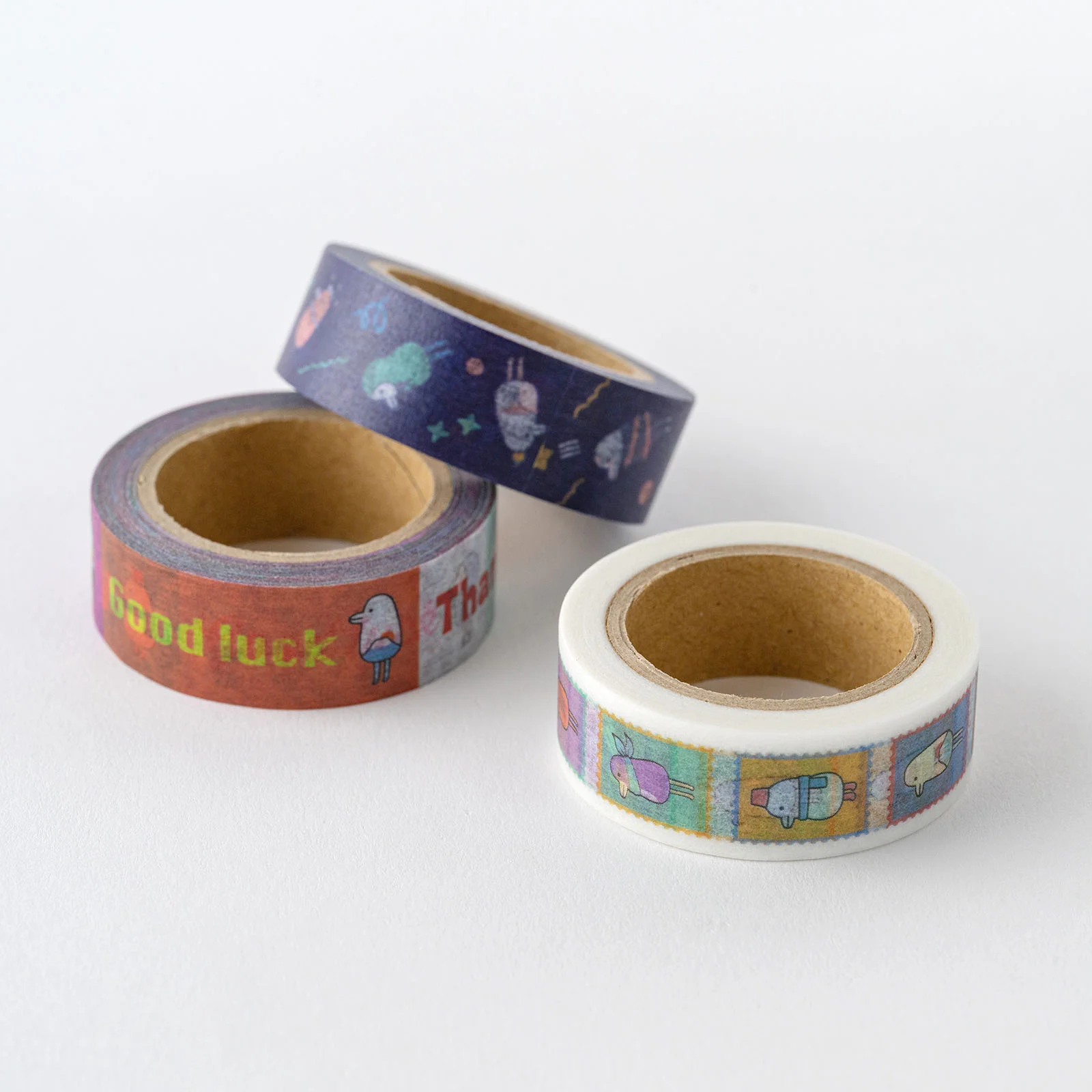 The Message design has the basic messages “Thank you,” “Hello,” “Happy,” and “Good Luck” alongside various Hobotoridori. You can easily tear a piece of tape and enjoy communicating how you’re feeling. These would also work well as titles for journal entries.