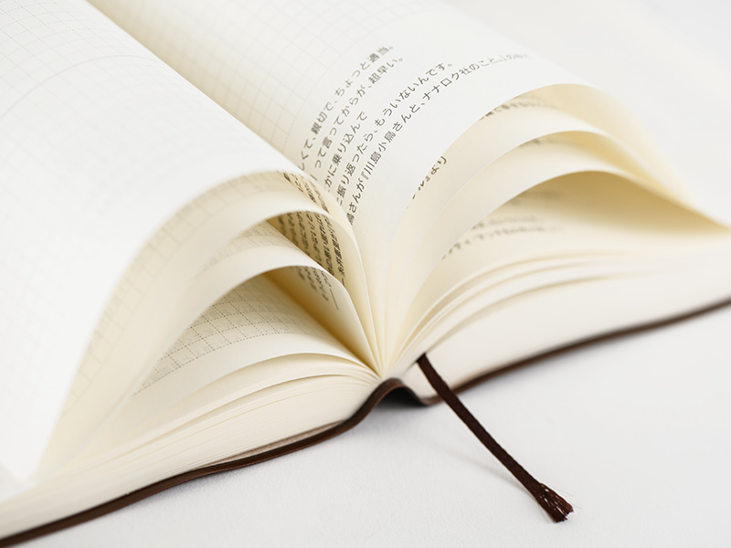 The book uses thin and light yet durable Tomoe River paper. It's characterized by its ability to hold ink well and provide a smooth writing experience.