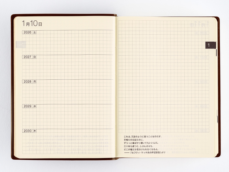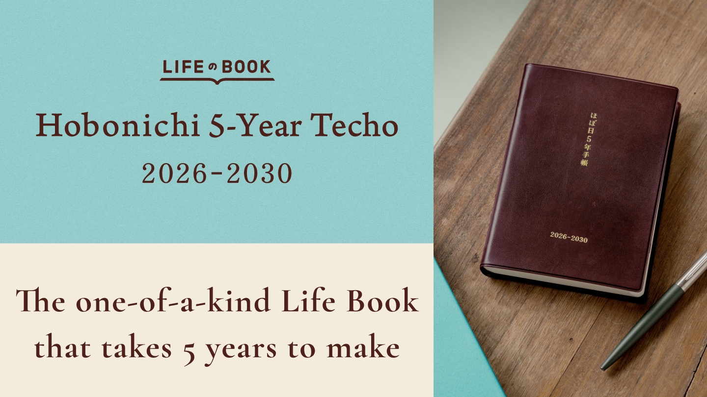 Since its launch in 1998, the Hobonichi Website has been updated daily. From a range of interviews, columns, reader submissions, and Hobonichi School content featured on the site, we’ve selected standout quotes for the 5-Year Techo. Each spread features one of these chosen words in Japanese.