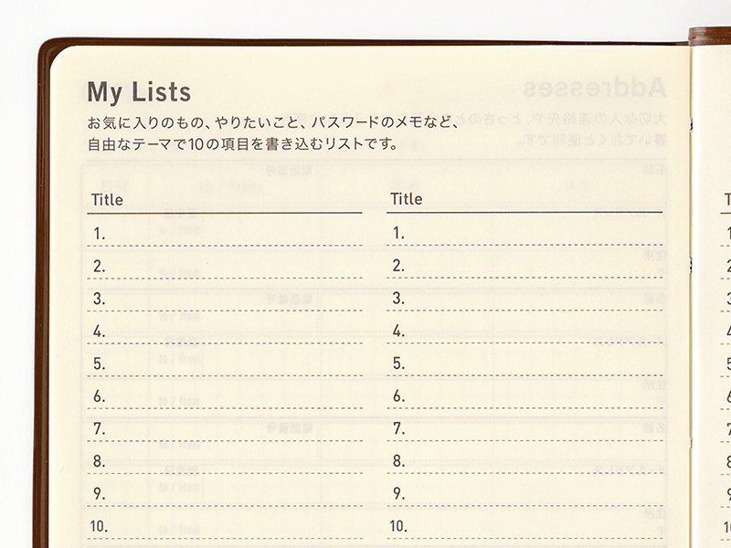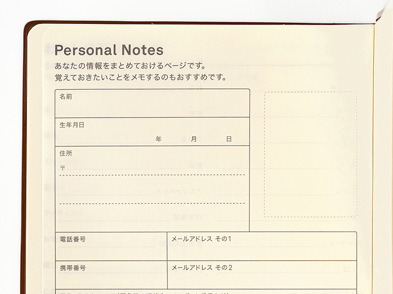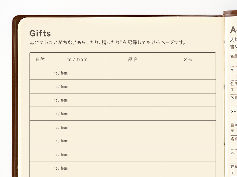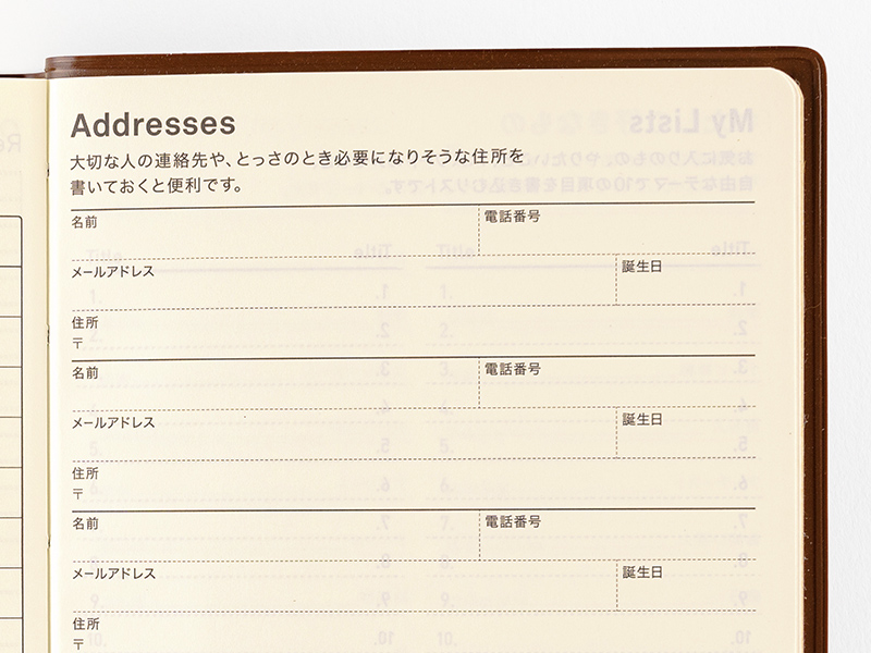 The address book allows you to write in the contact information for people such as family and close friends. The A6-size book has space for 6 entries, and the A5-size book has space for 16 entries.