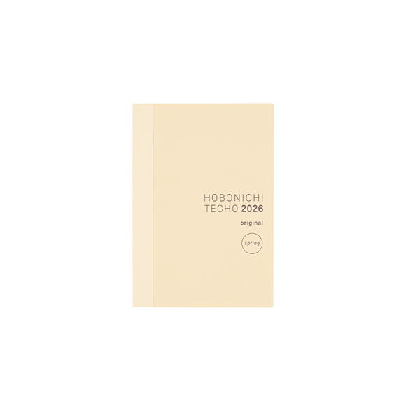 "The front has a soft ivory hue, and features the label “HOBONICHI TECHO 2026 original” printed in gray letters if the book’s weekly calendars start on Monday and red if they start on Sunday.
